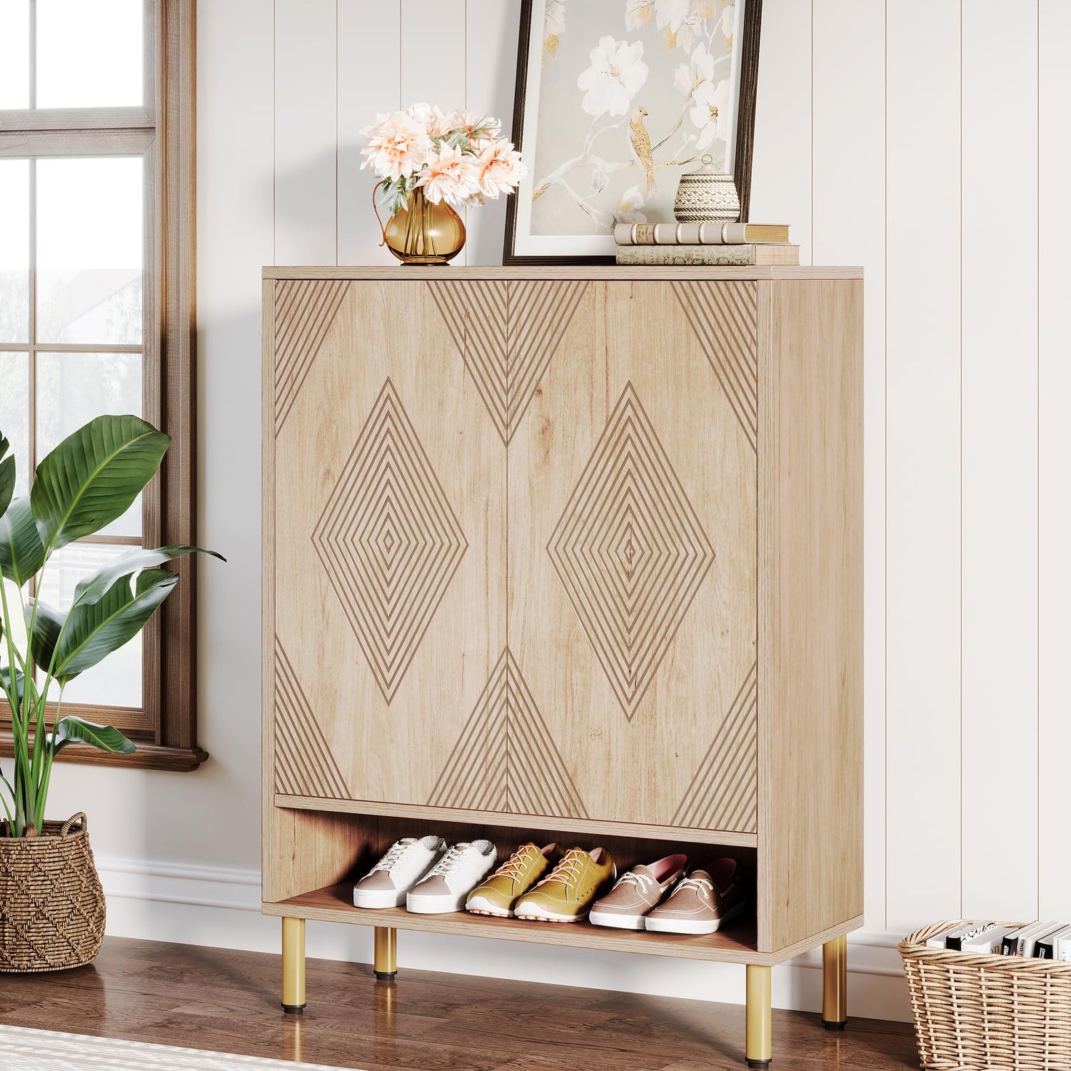 • [Exquisite Stylish Design]: This stylish shoe cabinet is great for an entryway, hallway, living room, or closet. Crafted with wooden boards and finished in a charming wood color, it perfectly complements your modern home space. It is worth noting that the rhombus pattern on the door makes the wood shoe cabinet more eye-catching and will impress your visiting friends.