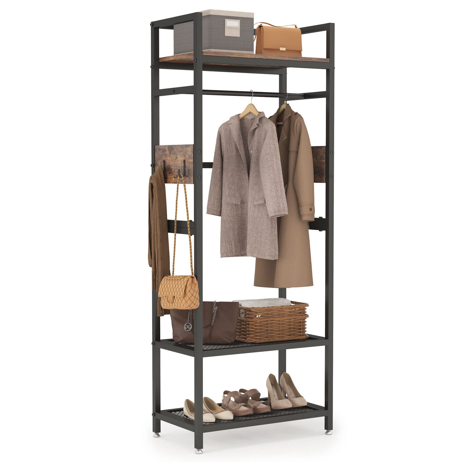 - ✔【Multifunctional Storage System】: Freestanding design, feature top shelf for storage boxes, four hooks on both sides for hats or bags, generous storage area for clothes in the middle, plus two bottom shelves offer additional space to keep your clothing, handbags, sweaters, shoes, boots, pants and accessories organized