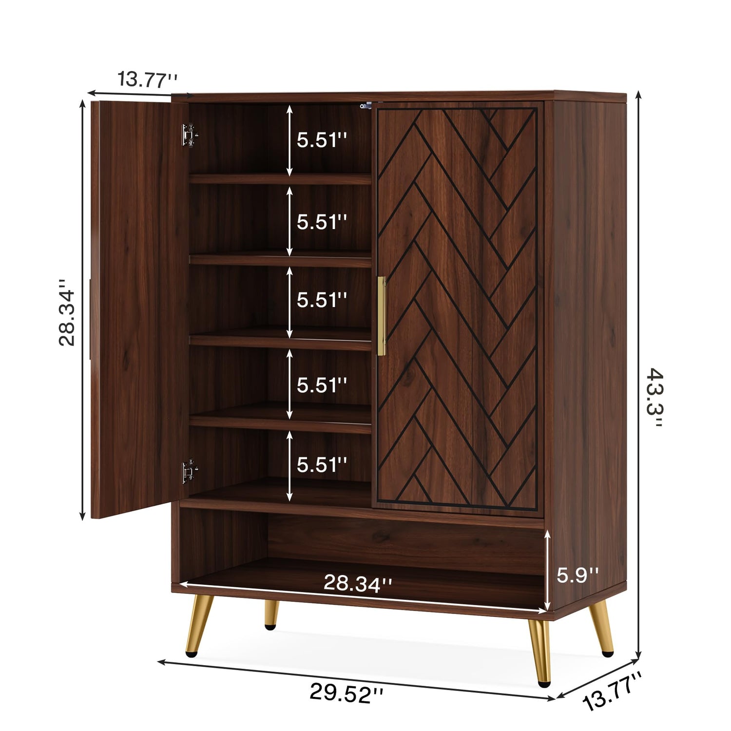 - 👞【Large Capacity】: Tribesigns walnut shoe cabinet helps you start a nostalgic and organized home life! This 6-tier shoe cabinet comes with adjustable panels to store different types of shoes, from flats and mid boots to high heels. With size of 29.6" W x 13.7" D x 43.3" H, it can accommodate up to 24 pairs of shoes (depending on the height and size of the shoes). The shoe cabinet with doors provides an enclosed space to keep your shoes clean, which is more practical than an ordinary shoe rack.