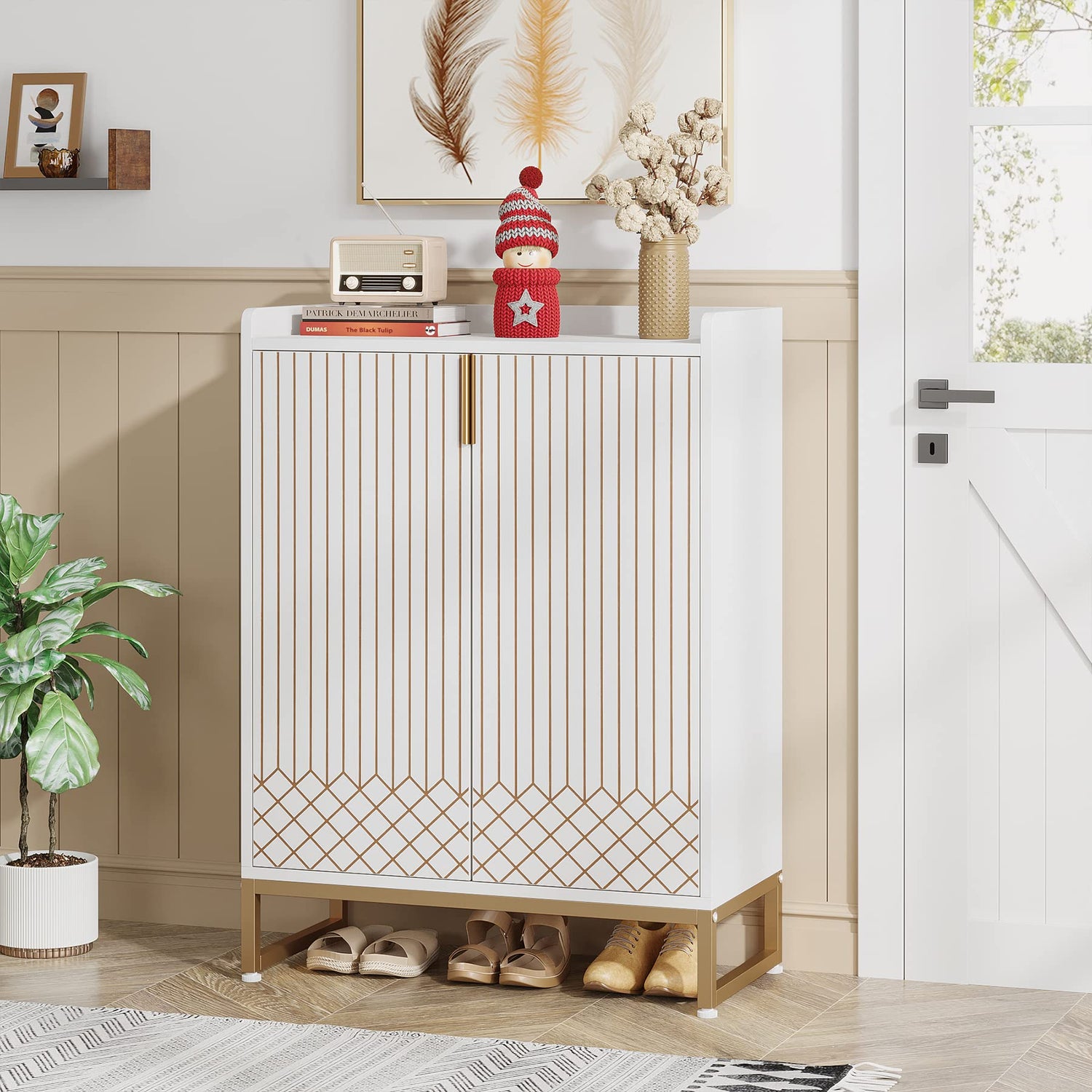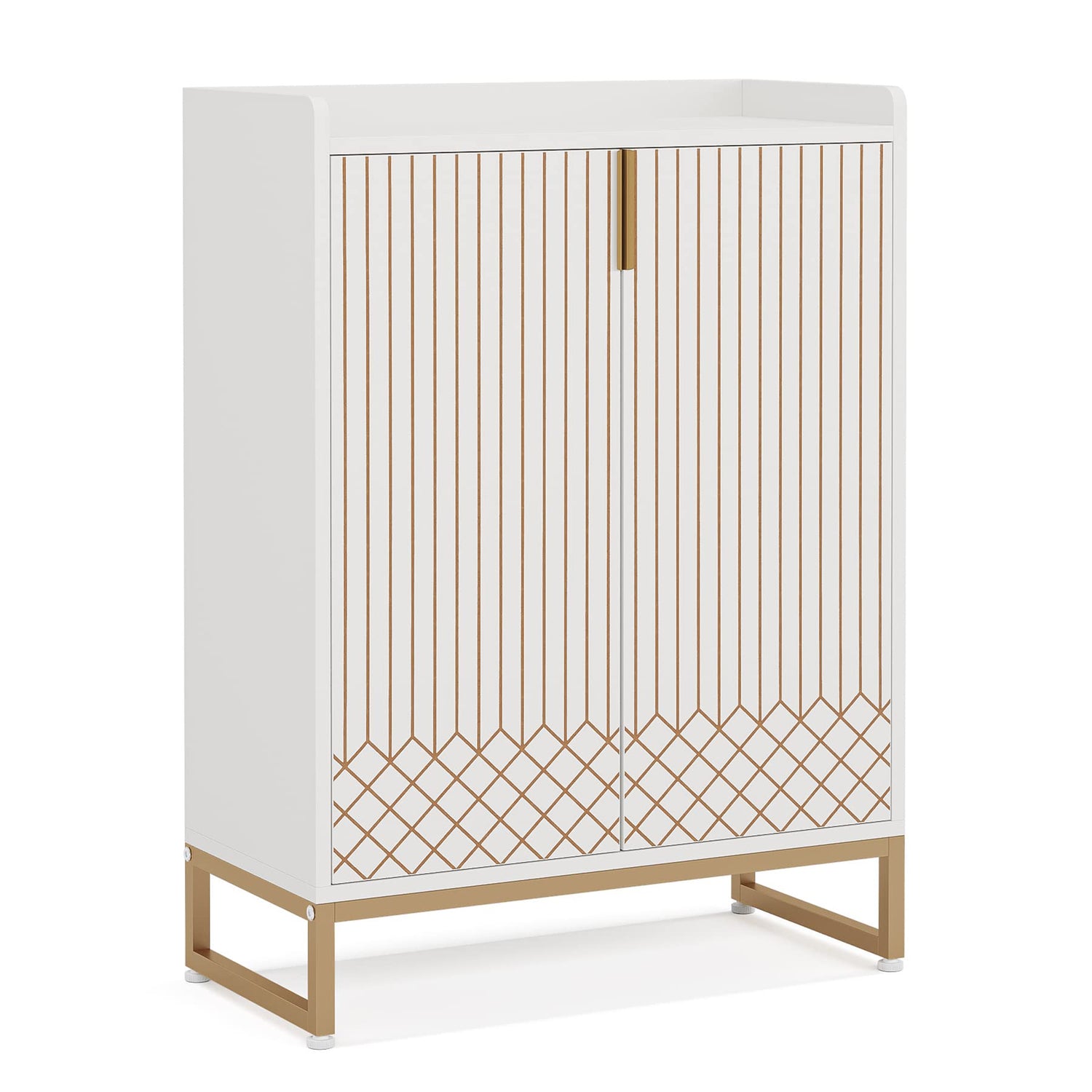 - 【Versatile, Stylish & Elegant】 - This white shoe cabinet features a minimalist design with a classic white finish and clean lines, seamlessly blending into any room while adding visual appeal. Gold strip accents and a diamond pattern finish provide a touch of low-key luxury, making it a versatile choice for modern homes.