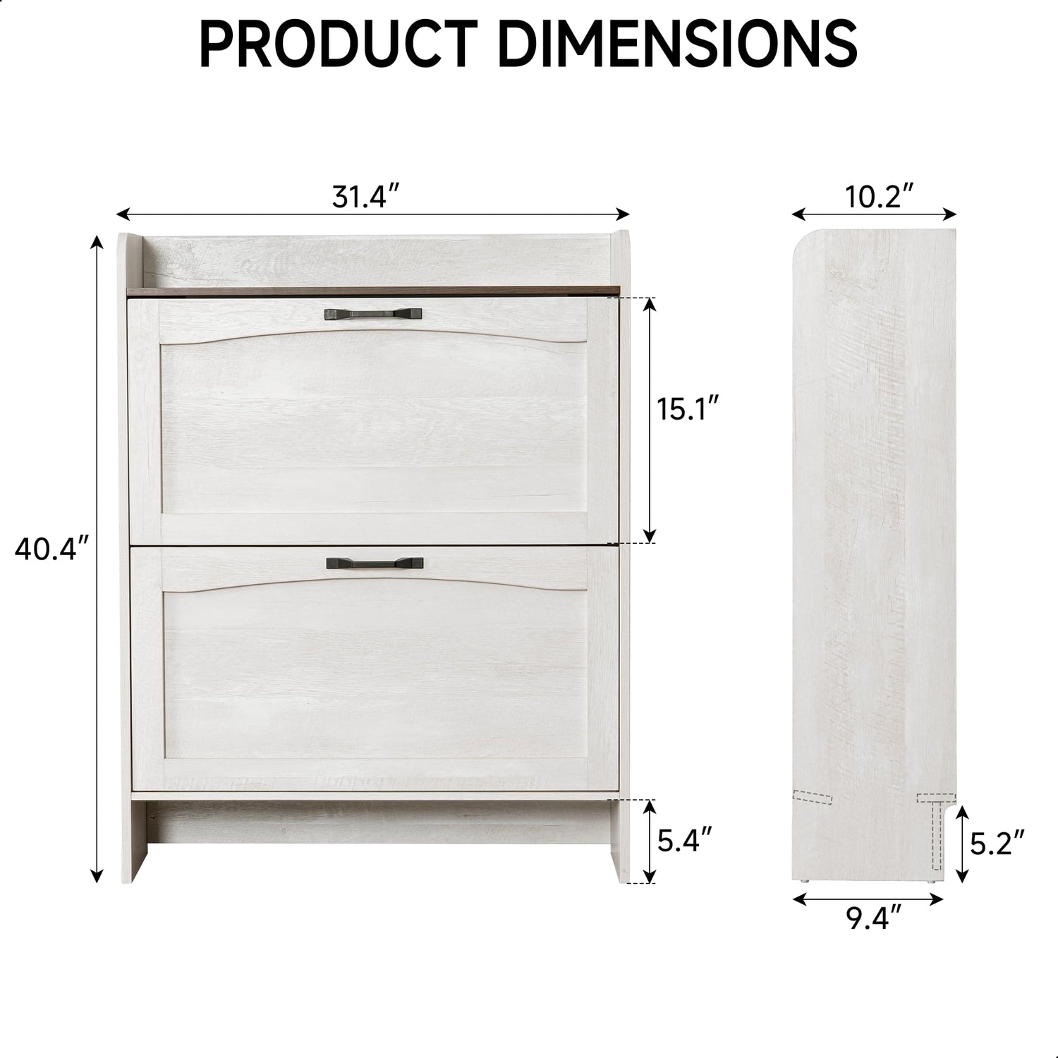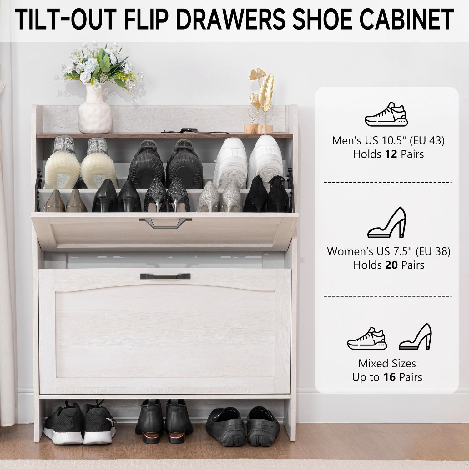 Details: Transform your entryway with this elegant shoe storage cabinet featuring two flip-out drawers in a warm white finish with walnut grain accents. Measuring 40.4 inches high, 31.4 inches wide, and 10.2 inches deep, this freestanding organizer offers versatile storage solutions for the whole family. The cabinet can accommodate up to 12 pairs of men's shoes (up to US 10.5/EU 43), 20 pairs of women's shoes (up to US 7.5/EU 38), or a mixed combination of up to 16 pairs. The thoughtfully designed flip-out drawers make accessing your footwear collection effortless while maintaining a clean, organized appearance. A decorative top fence adds both style and functionality, perfect for displaying small decor items or temporary placement of items while getting ready. The sleek, narrow profile makes it ideal for entryways, mudrooms, or bedrooms where space efficiency is key. The cabinet's contemporary design seamlessly blends with various home decor styles while providing practical storage that keeps your shoes protected from dust and organized.