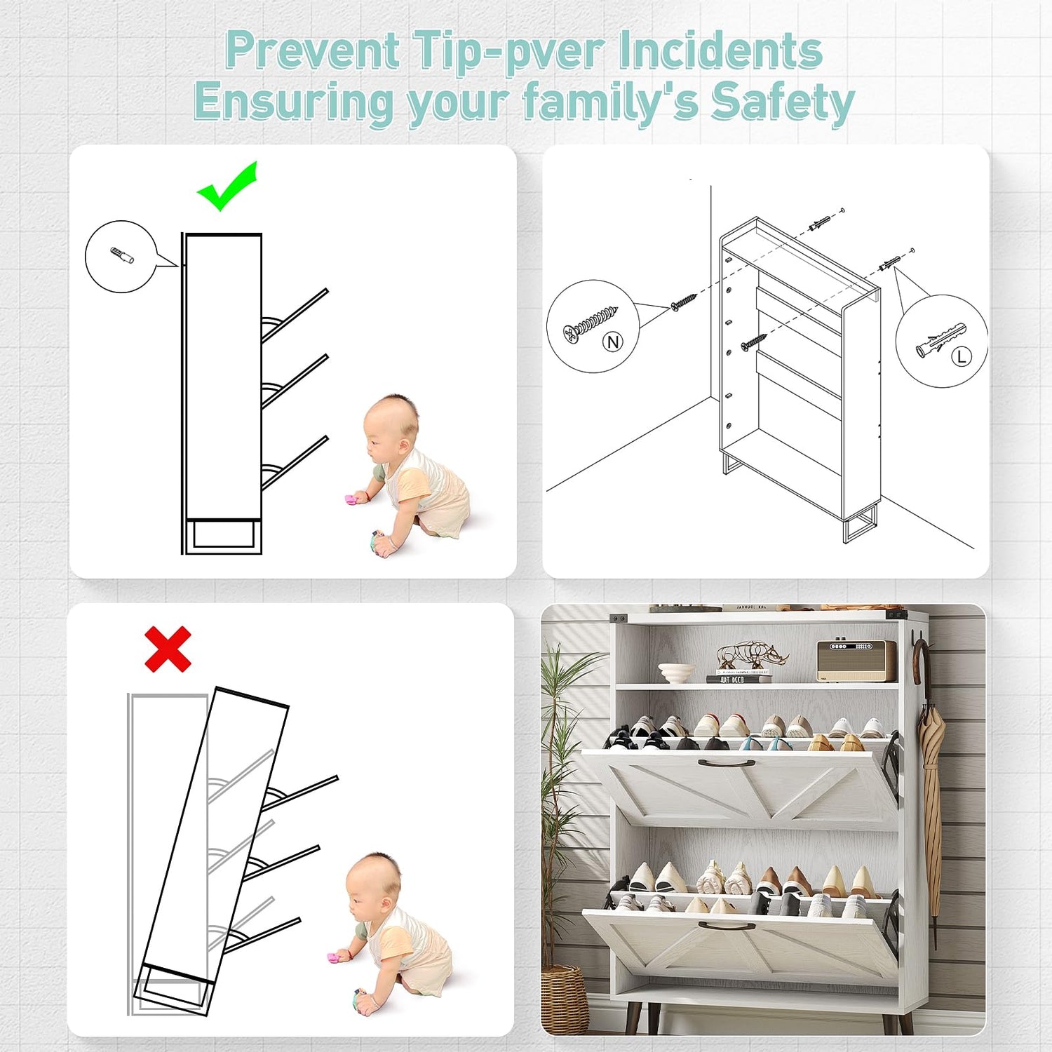 - Shoe Cabinet with High Quality: Made of high-grade MDF, which lasts for long-term use and can bear the weight of a large number of shoes.The anti-tipping kits can prevent injuries from furniture tip-over, this item should be securely fixed to the wall.