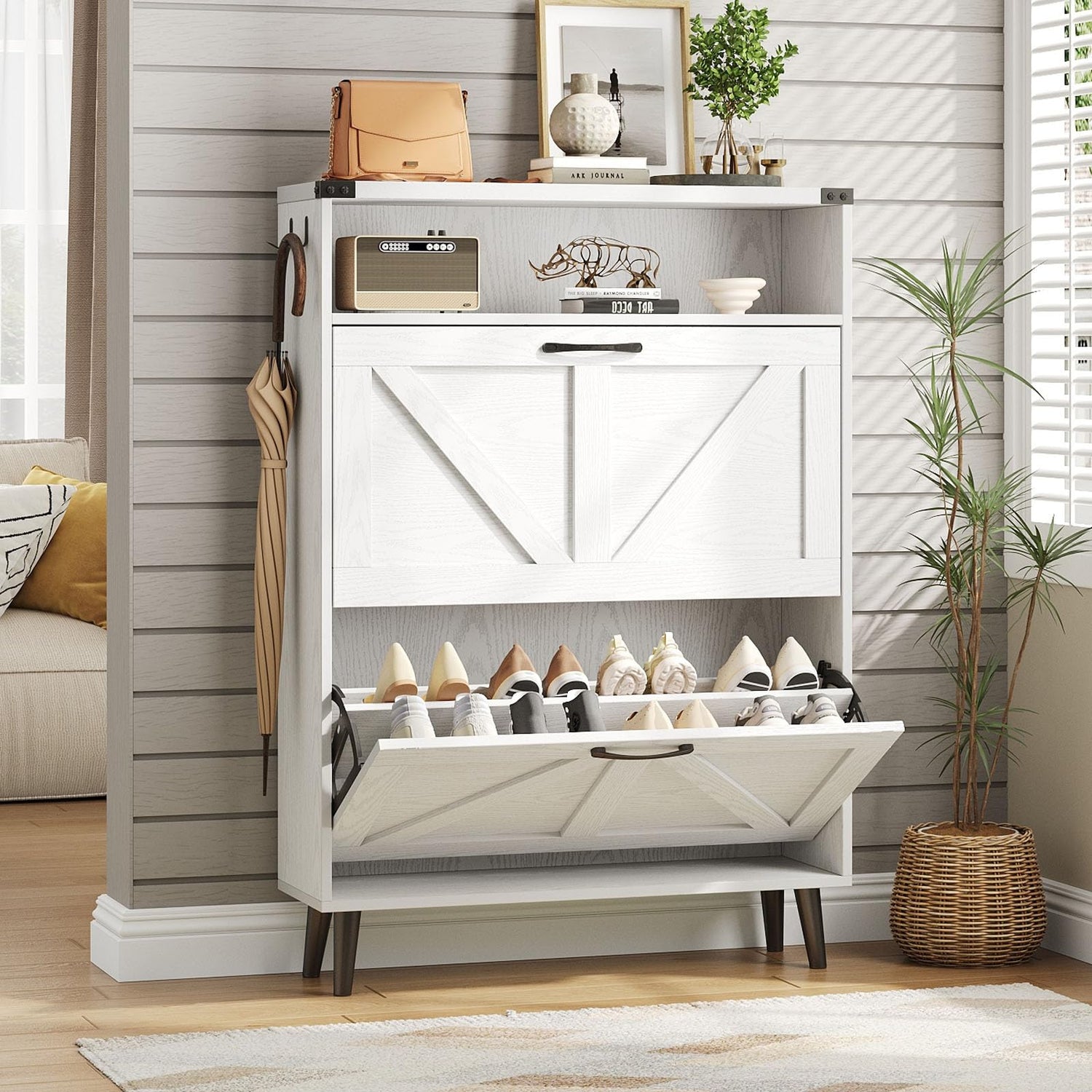 - Entryway Slim Shoe Cabinet:This entryway shoe storage with 2 Flip Drawers only takes a little space.It can be placed in your entryway to store your shoes without taking up a lot of space in the doorway.
