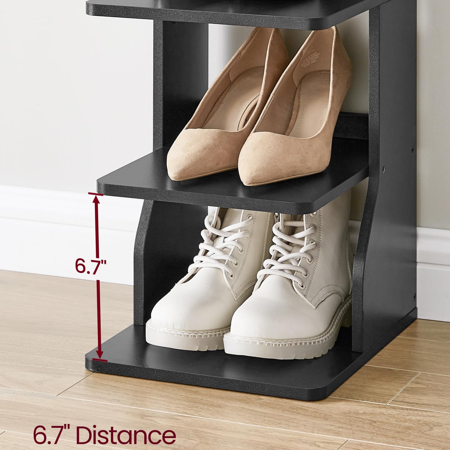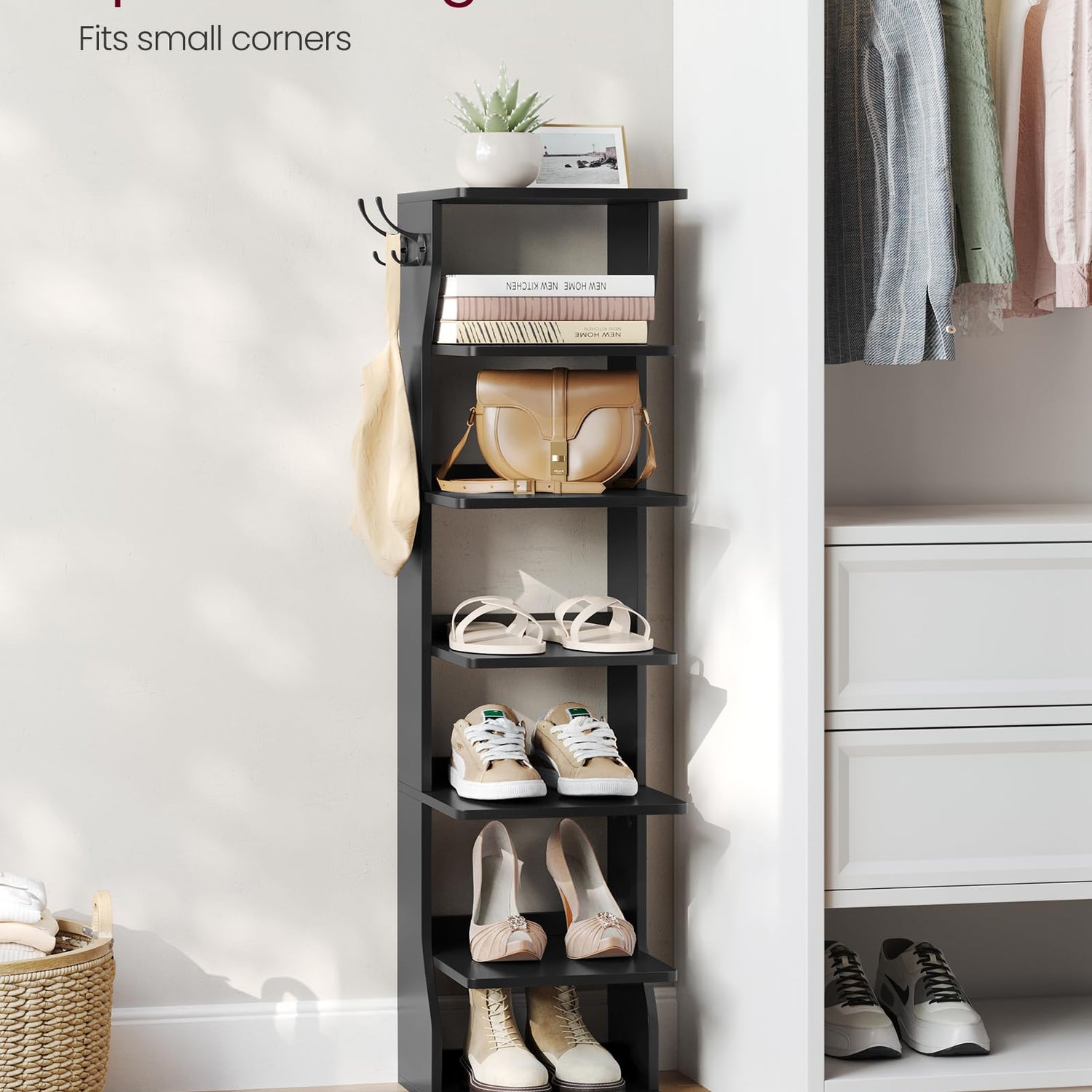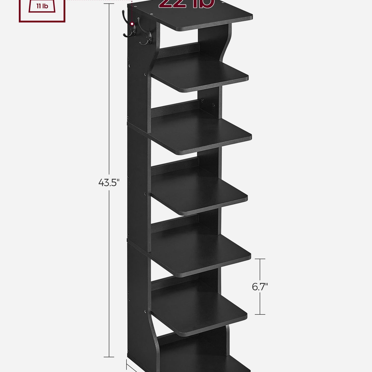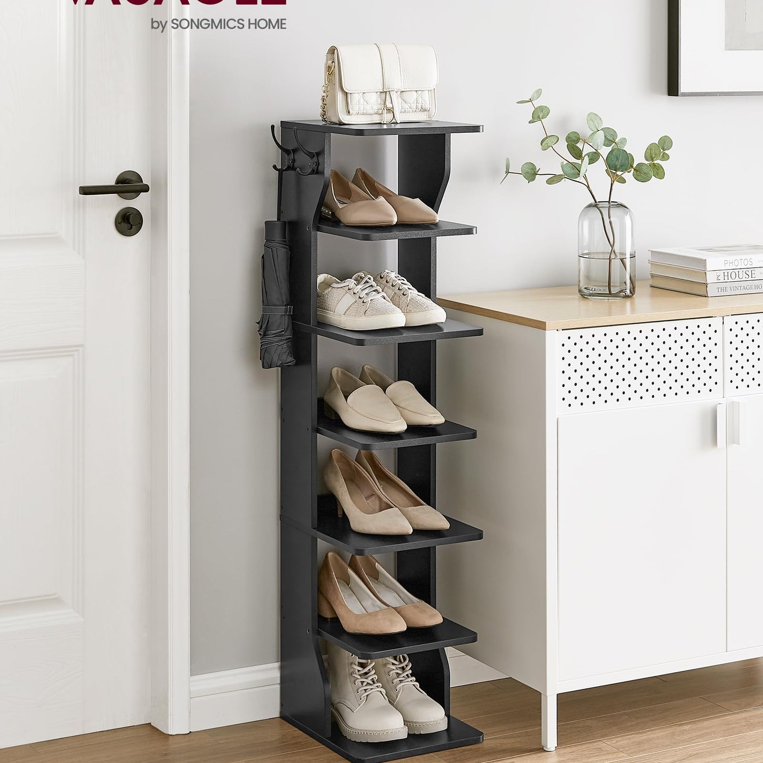 VASAGLE 7-Tier Vertical Shoe Rack, Narrow Shoe Storage Organizer with Hooks, Slim Corner Shoe Tower Rack, Space Saving for Entryway and Bedroom, Black ULBS200T16