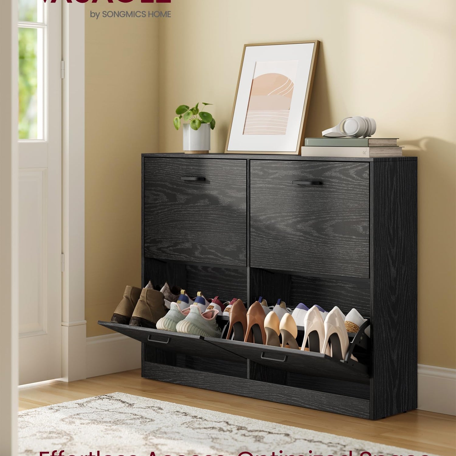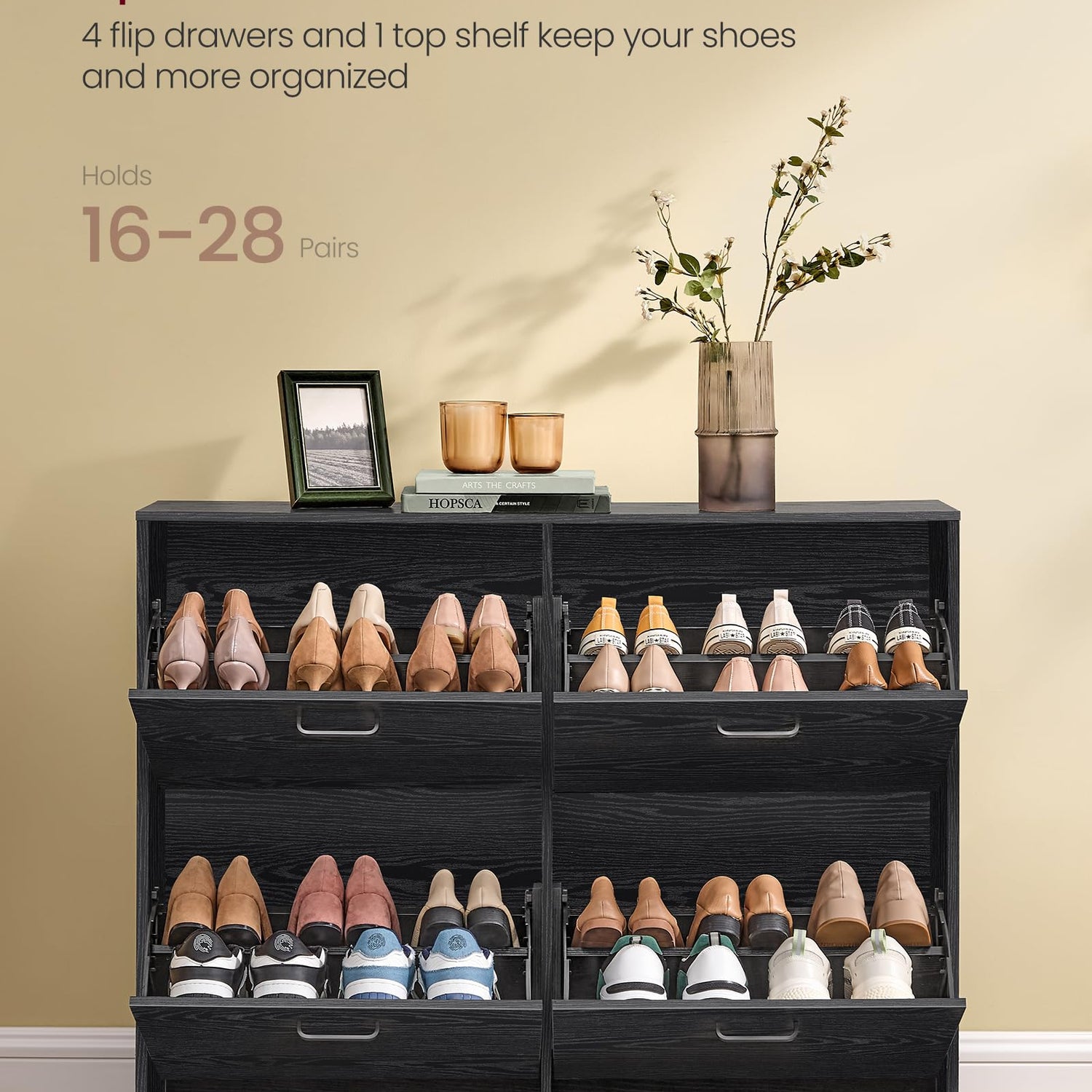 - Plenty of Storage: This shoe cabinet with 4 flip doors can hold 16-28 pairs of shoes, perfect for the whole family. The top shelf is also a great place for plants, pictures, etc.