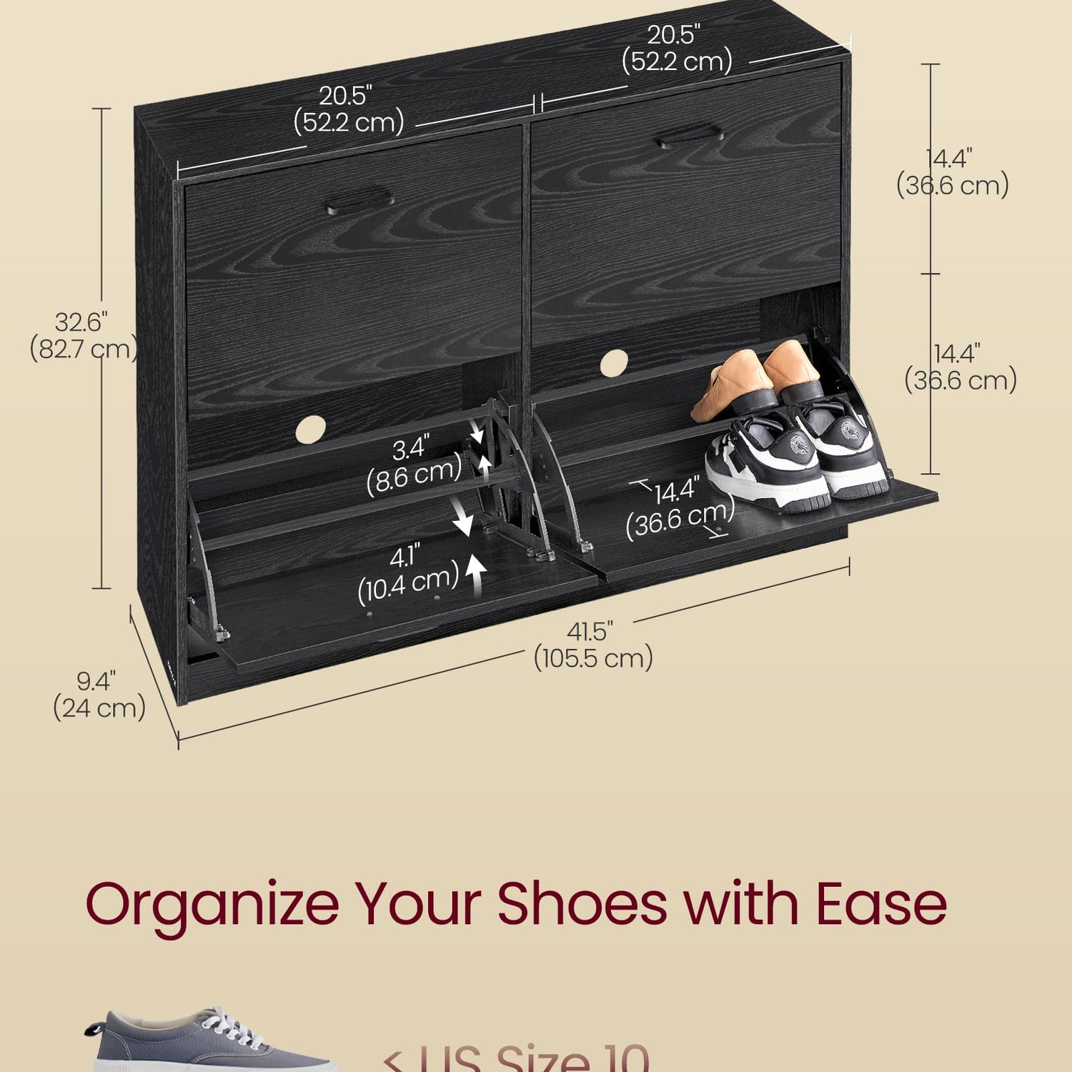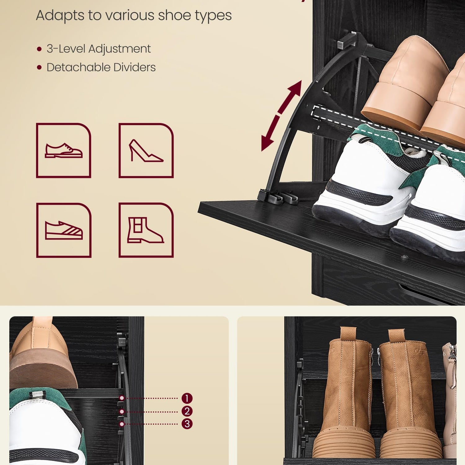 - Flexible Dividers: With removable dividers and 3 adjustable levels per divider, this shoe cabinet adapts to your needs for different sizes of shoes