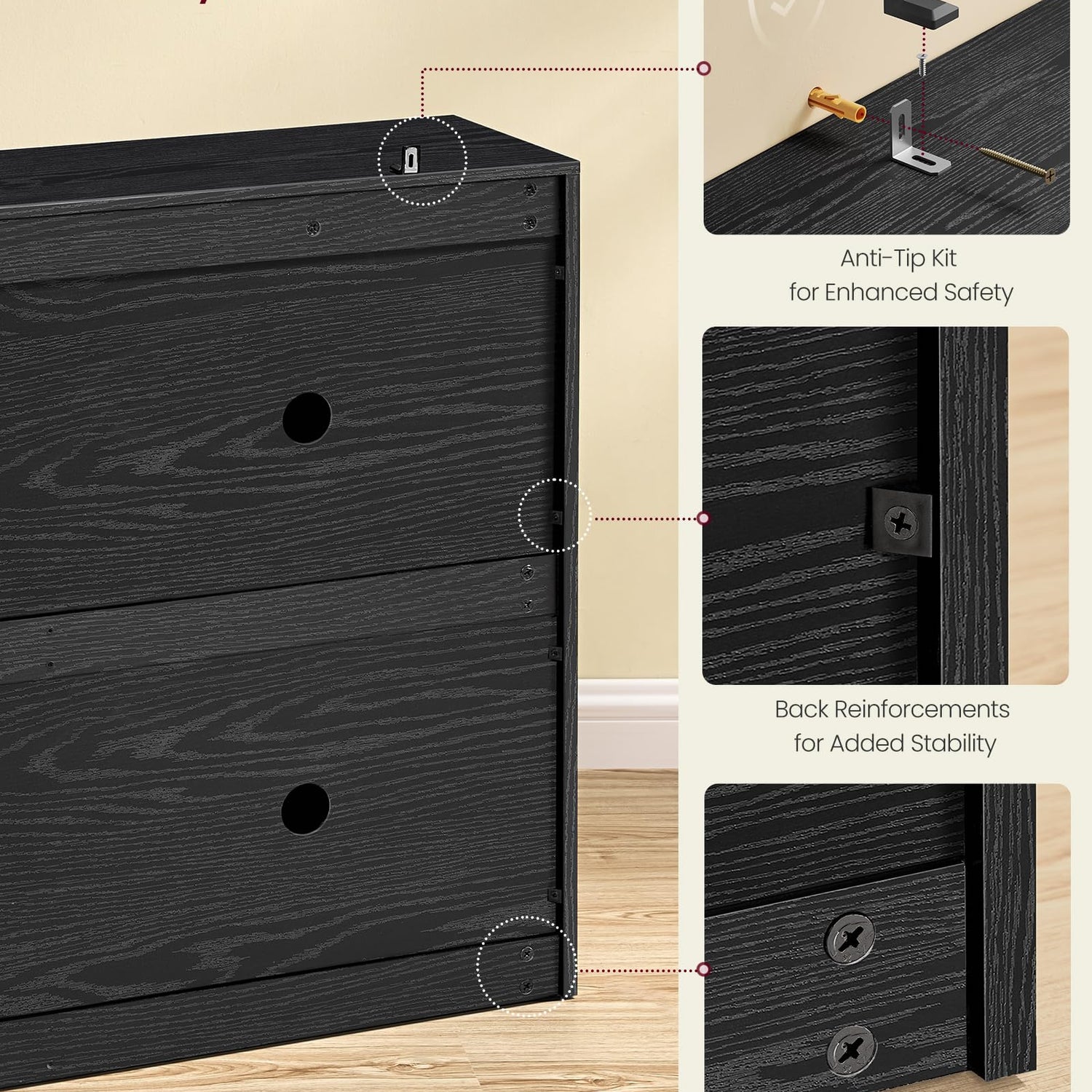 - Durable & Stable: Premium particleboard panels are joined by 2-in-1 cam lock dowels, which are not easy to warp and crack for durability. The included anti-tip kit provides more stability