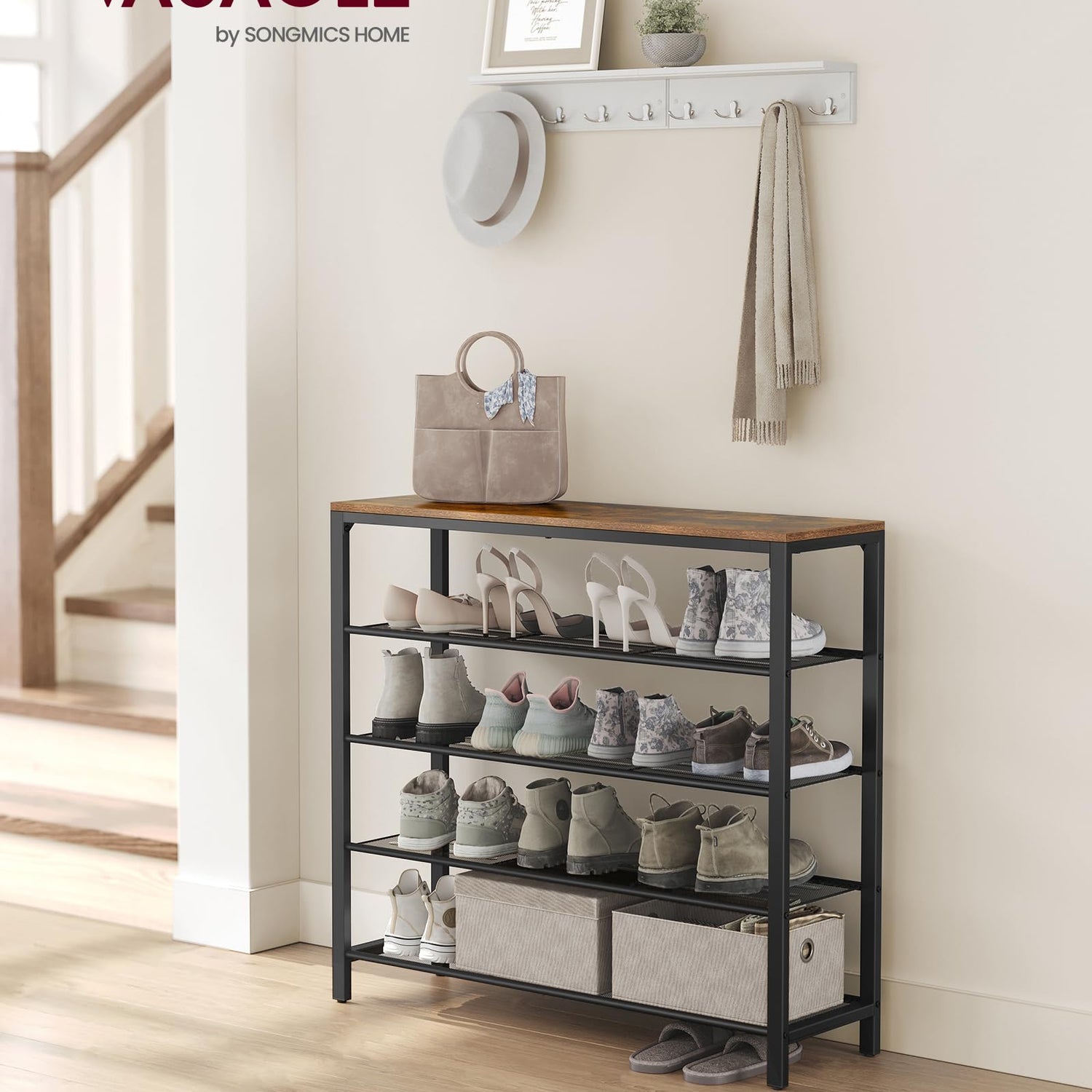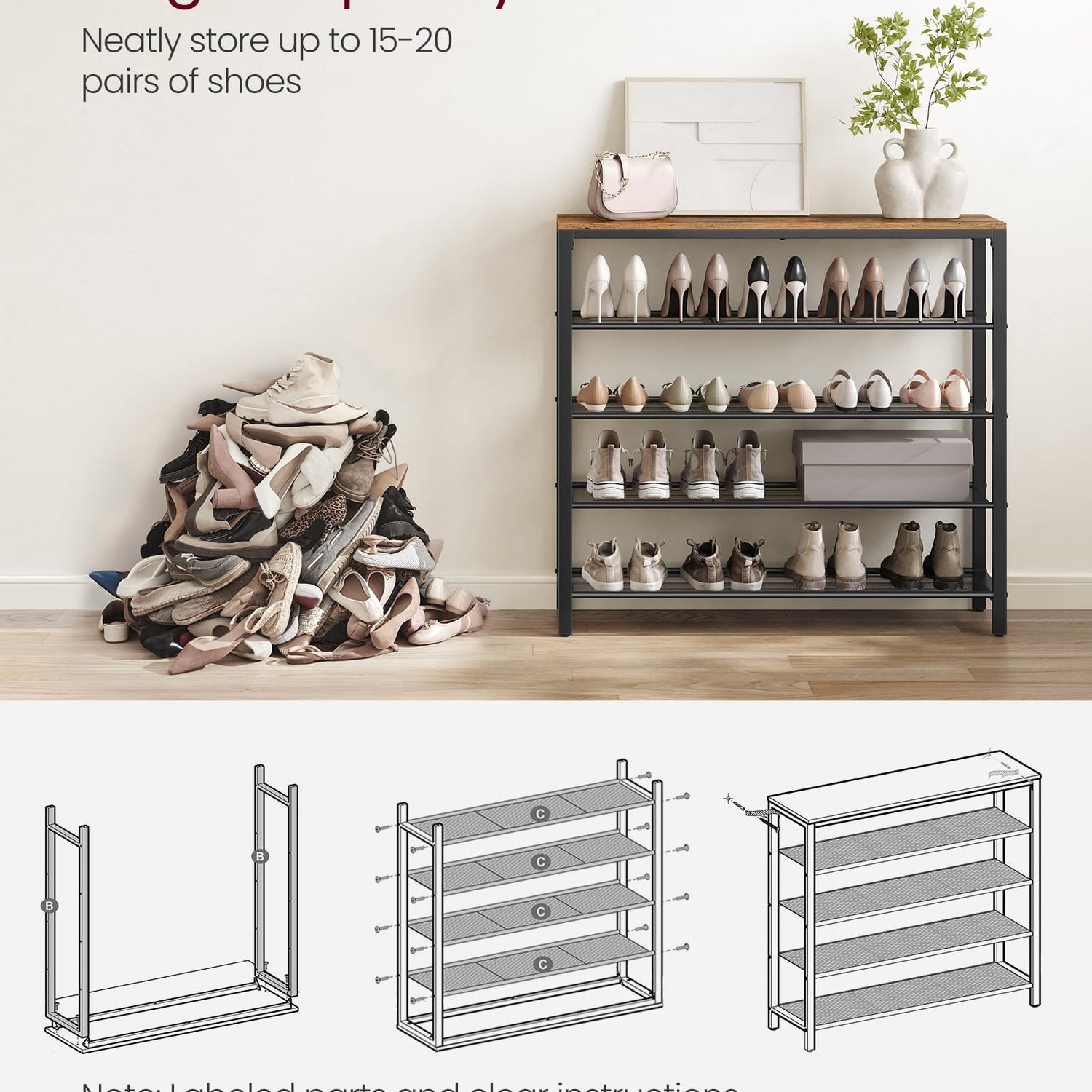 VASAGLE Shoe Rack, 5-Tier Shoe Storage Organizer with 4 Metal Mesh Shelves for 16-20 Pairs and Large Surface for Bags, for Entryway, Hallway, Closet, Industrial, Rustic Brown and Black ULBS15BX