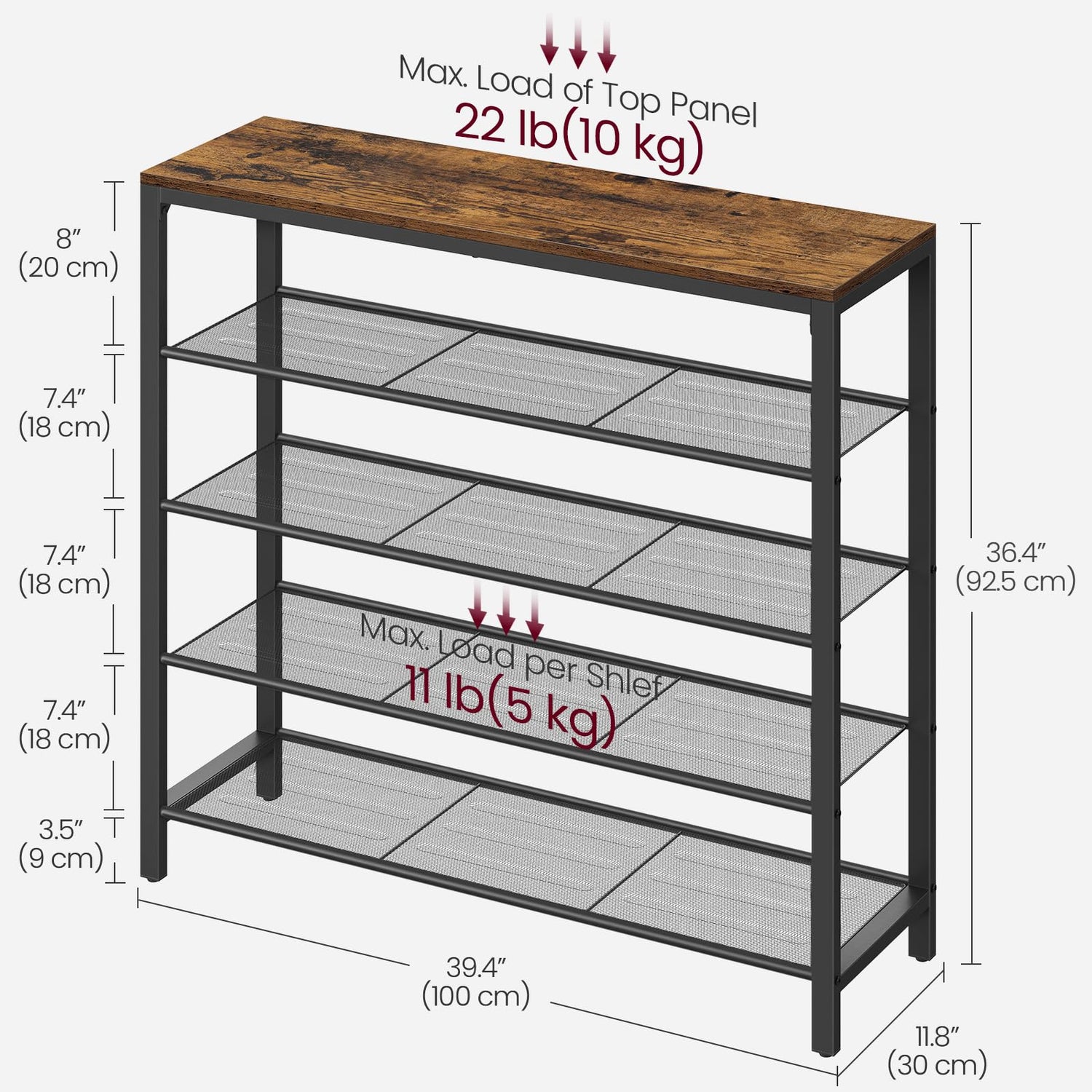 - [Strong Design]4 open shelves with dense steel mesh offer plenty of space for your shoes; the eye-catching rustic brown surface welcomes bags, keys, picture frames, or a pretty bouquet of roses (top surface holds up to 22 lb, shoe shelves up to 11 lb each)