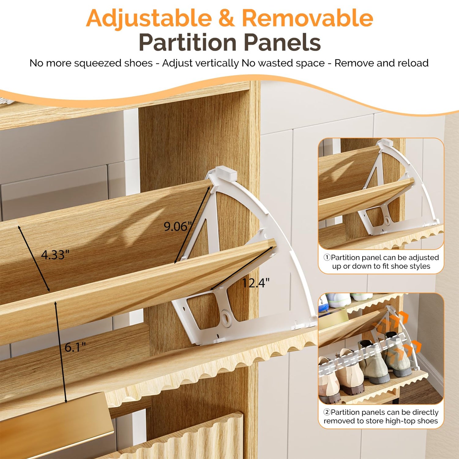 VINGLI Fluted Shoe Cabinet Storage for Entryway,Hidden Shoes Storage Cabinet with 2 Flip Drawers, Mid Century Modern Shoe Rack Organizer,Free Standing Shoes Organizer for Hallway(Natural Oak)
