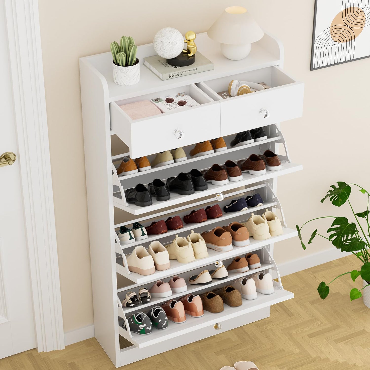 VOWNER Shoe Cabinet with 3 Flip Drawers & 2 Drawers, Freestanding Shoe Storage Cabinet with Adjustable Shelves, Shoe Organizer for Entryway, Hallway, Living Room, White