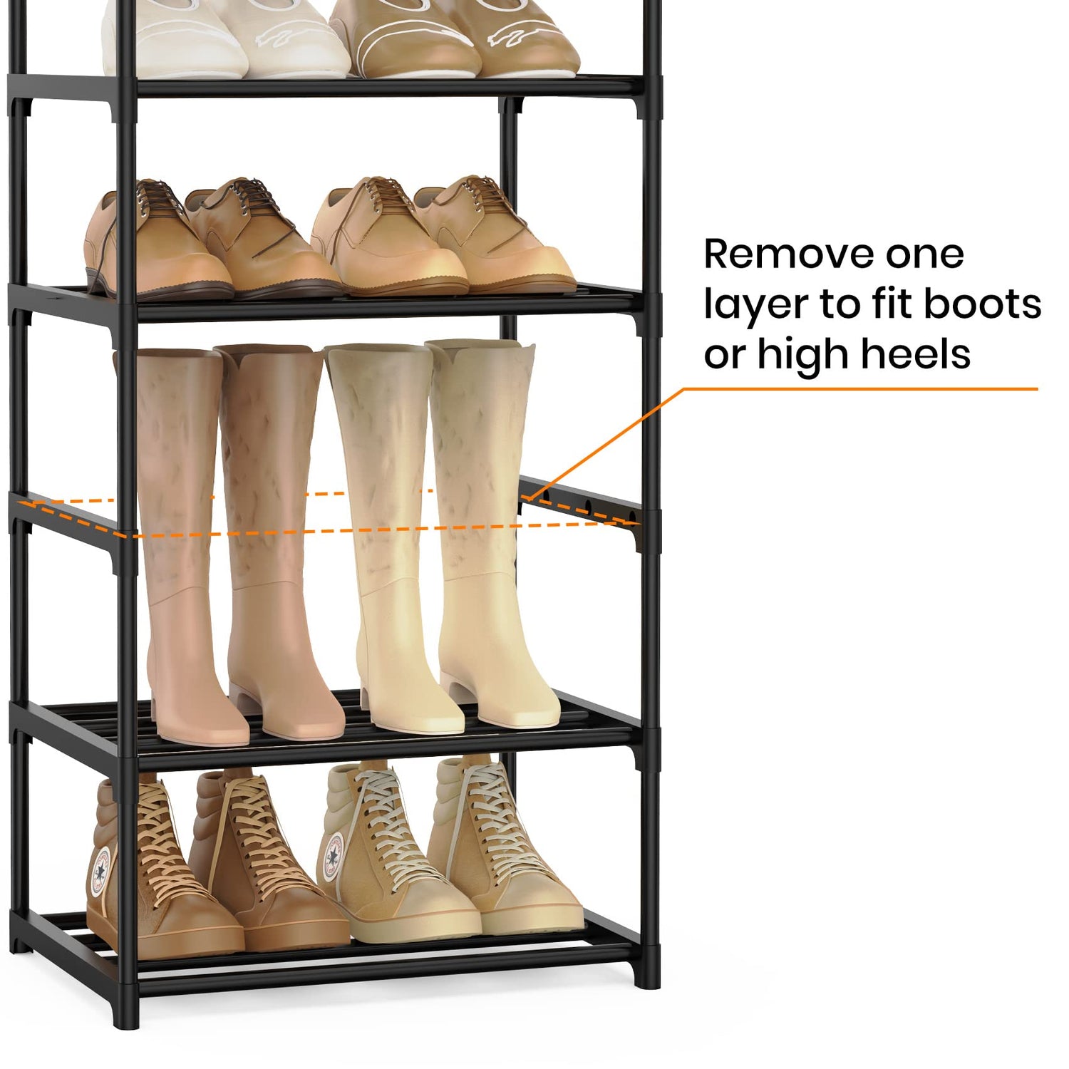 - 【EXPANDABLE & DIVIDABLE SHOE SHELVES】: You can order two shoe racks and build them together as a large one that can hold all family member’s shoes and keep organized. You can remove the one or some layers to store boots, high heels, or other larger accessories to suit different scenarios. 10 tier shoe rack can split into 5 tier shoe rack 2 units, one for hallway and others for closet and room. A great solution to keep your busy entrances and other storage areas away from clutter.