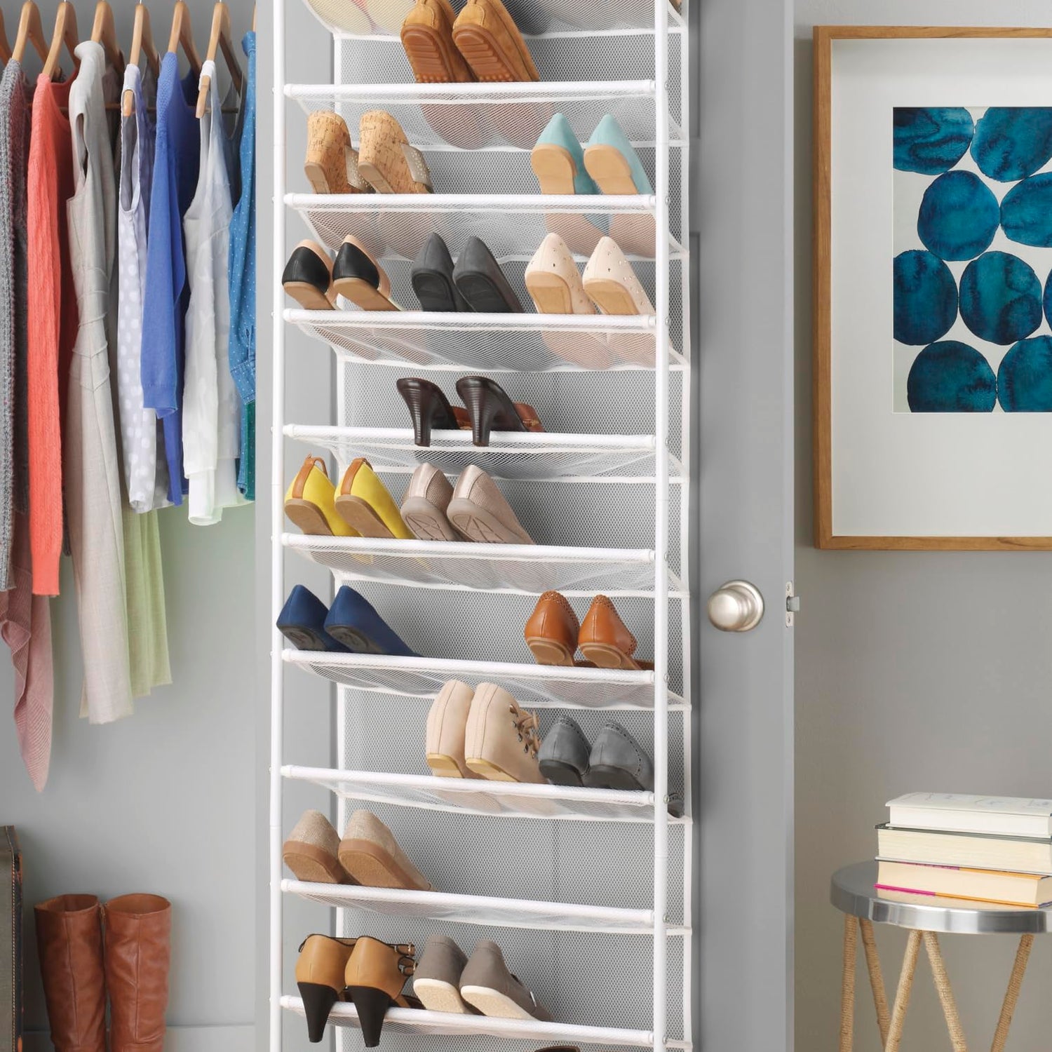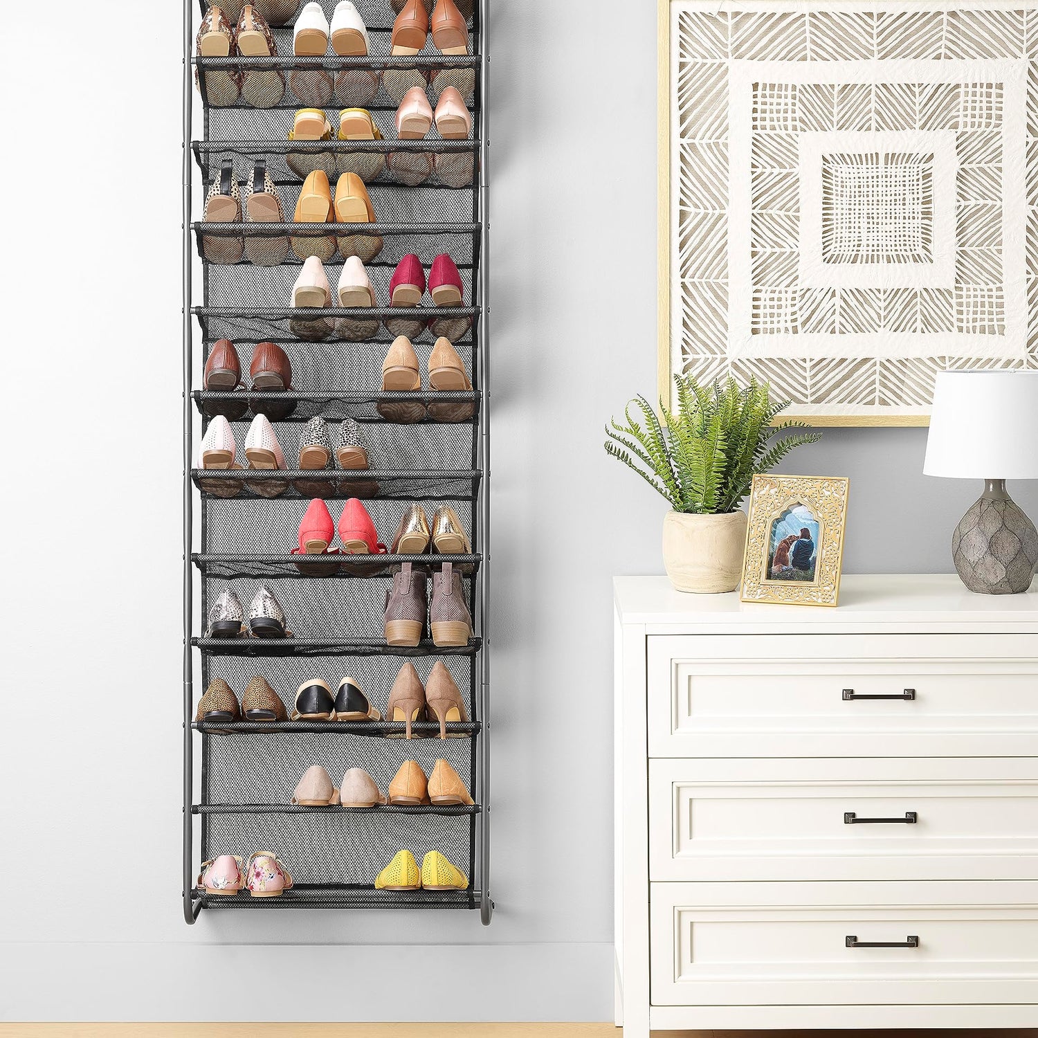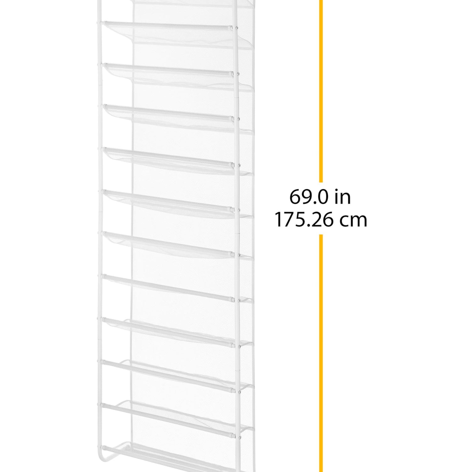 Details: Shoes are an important part of any wardrobe. Whether your collection is all about function or an extension of your style, keeping them neat and accessible means getting out the door a little easier. While using that dead space behind your door, Whitmor's Mesh and Metal Over-The-Door Shoe Rack holds up to 36 pairs of shoes on display to easily find what you are looking for. It saves time while also protecting your investment. The unique metal and mesh design combination optimize durability and functionality. The mesh-lined back prevents shoes from falling out while protecting the door from scuffs. The over-the-door hooks adjust to accommodate varying door sizes