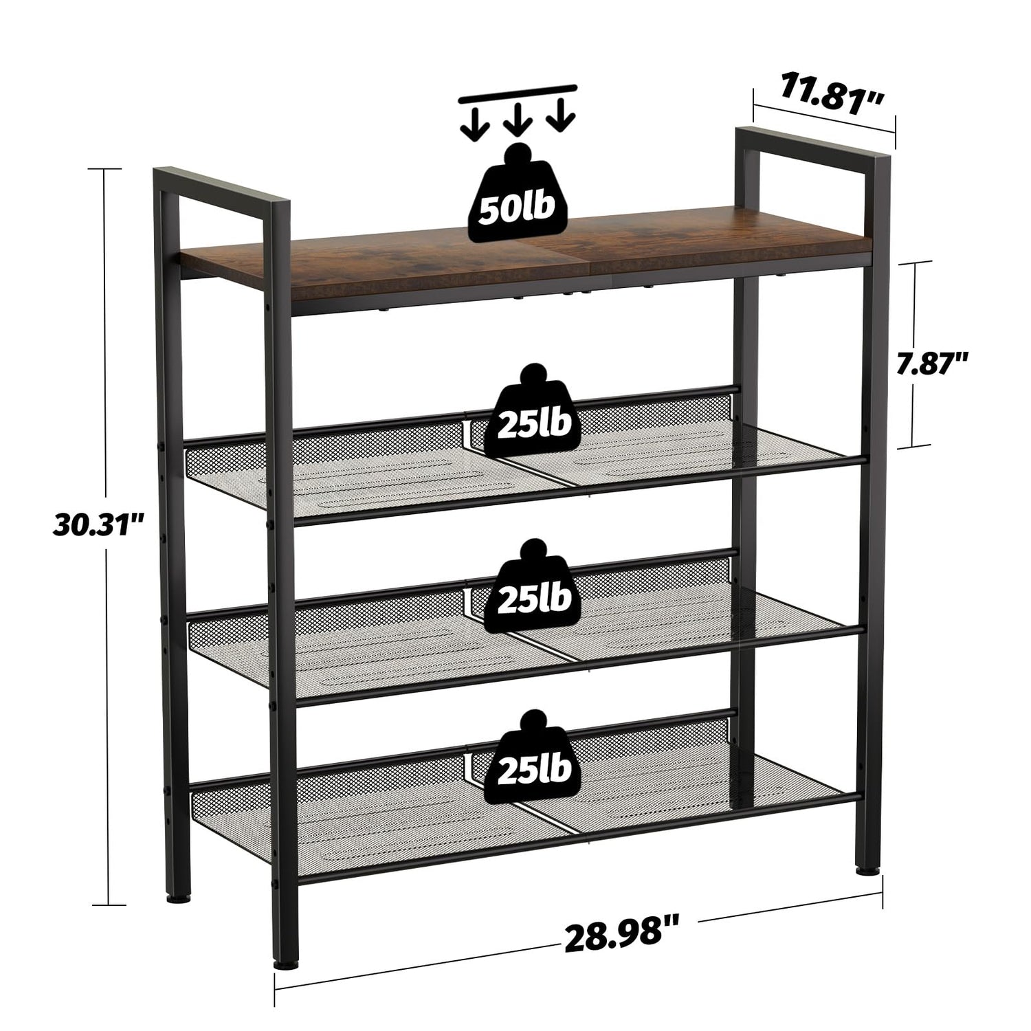 • 【Sturdy Shoe Rack for Entryway】Crafted from a robust metal frame and high-quality particle board, this entryway shoe rack can support up to 50 lbs on the top and 25 lbs on each shelf. The dense mesh design ensures that even high heels won't fall through. Additionally, it features adjustable feet for stability on uneven floors and raised back edges to prevent shoes from rubbing against the wall.