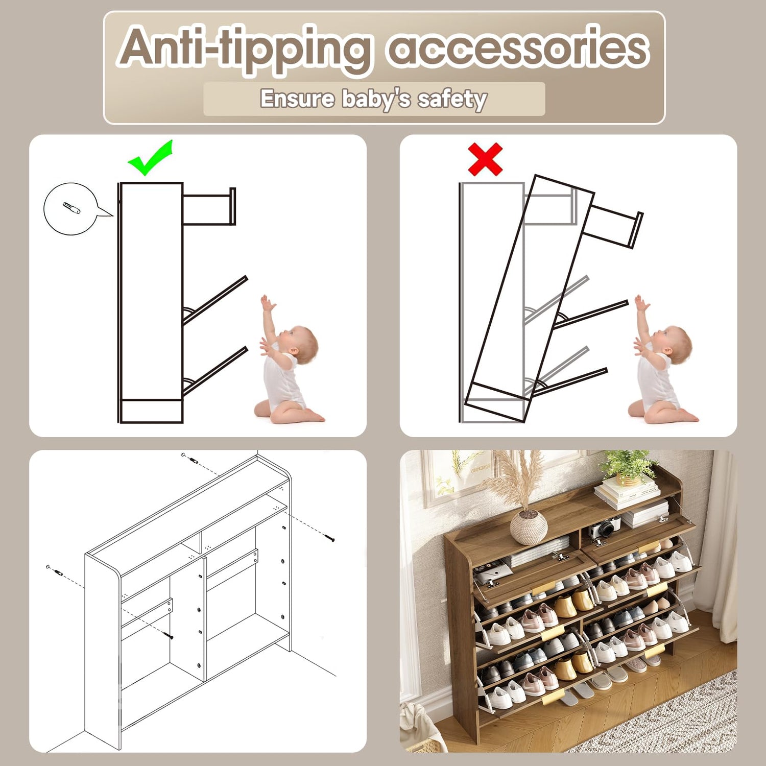 - LARGE CAPACITY SHOE CABINET with ADJUSTABLE SHELVES: This hidden shoe cabinet can accommodate up to 24-30 pairs of shoes. Very user-friendly design with well-thought-out compartments that hold shoes of all types securely and keep everything accessible. The large tabletop with a fence is ideal for placing photos, plants, and other decorations without worrying about falling; the raised bottom can be used to place slippers or robot vacuum cleaners