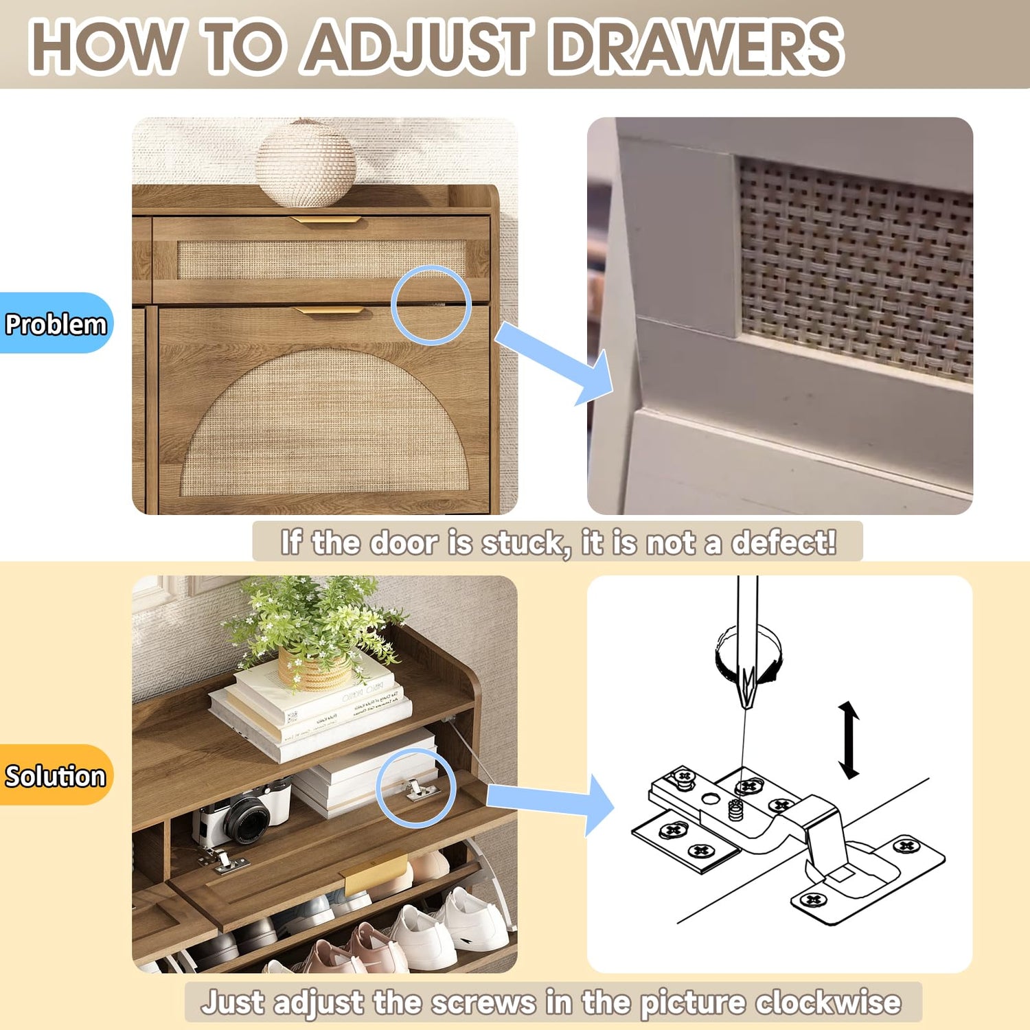 - ENTRYWAY SHOE CABINET with HANDCRAFTED RATTAN: The rattan shoe storage cabinet with soft and smooth half-round geometric beauty brings comfort, relaxation and peace of mind. The wood tone is very pleasant and neutral, creating a warm and friendly family atmosphere. In addition, the hand-woven rattan craft can better convey warm emotions than cold machines and reduce emotional anxiety. Perfect for placing in the entryway, hallway, living room, or porch