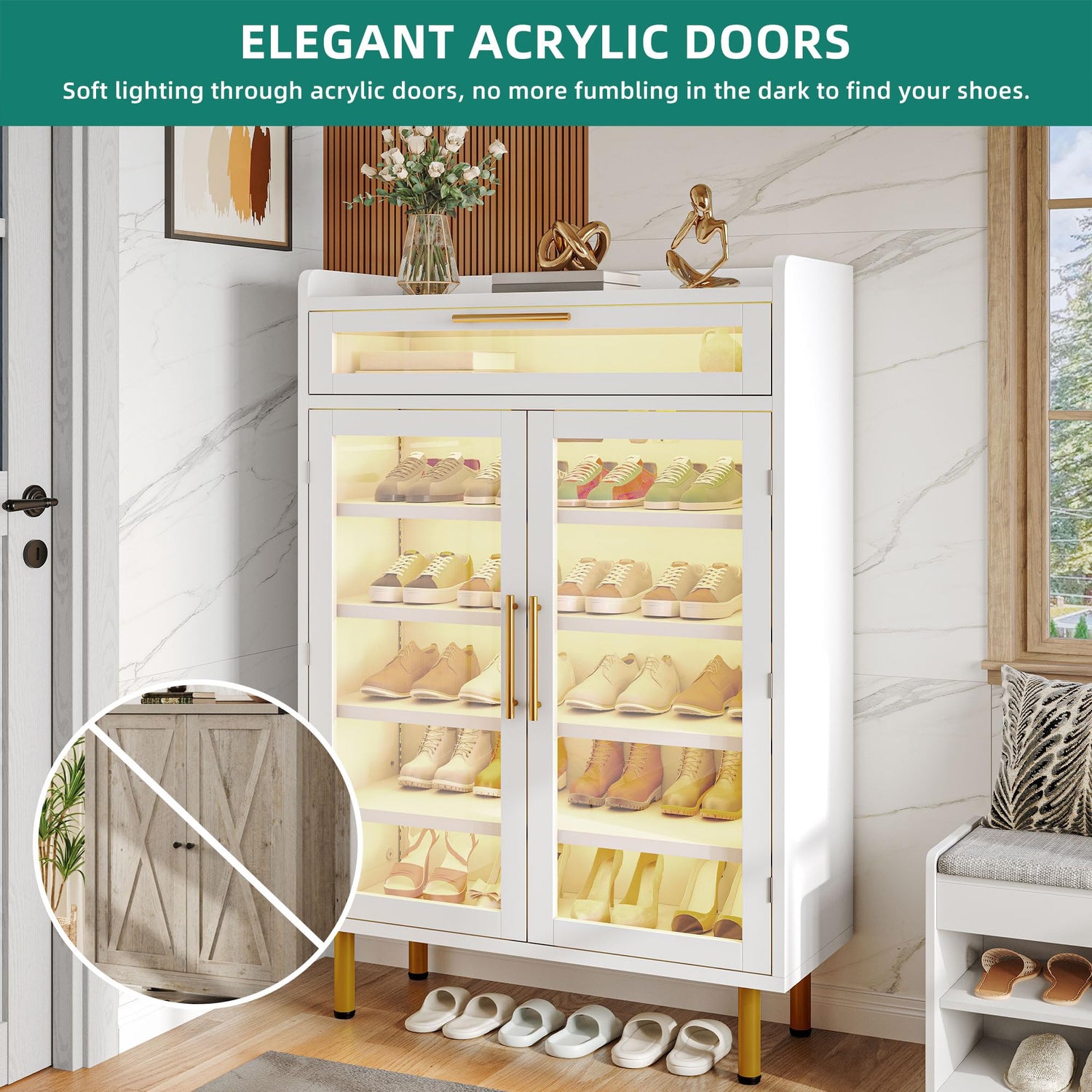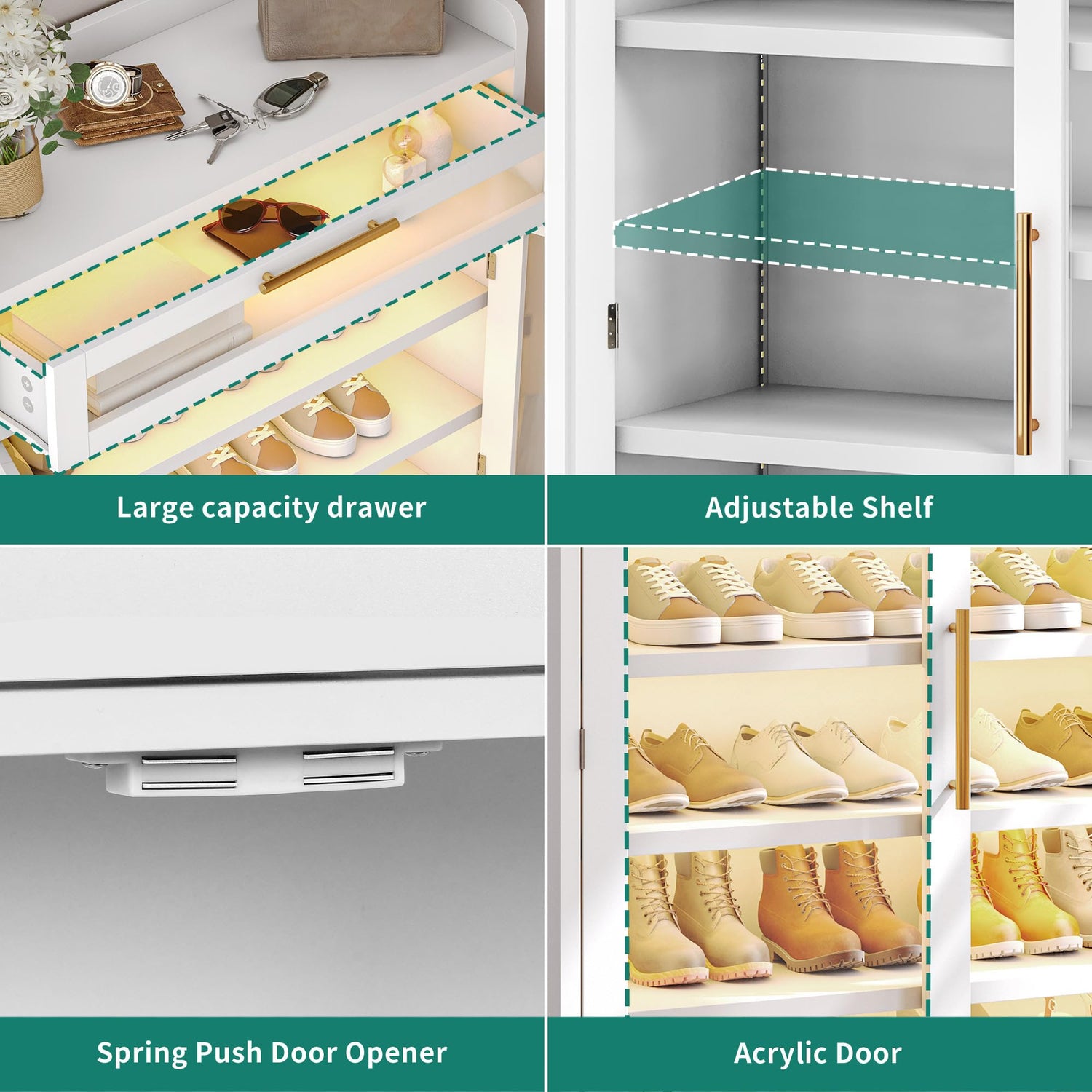 YITAHOME Shoe Cabinet Entryway, Modern Shoe Storage Wooden with Drawer and LED Lights, Freestanding Shoe Organizer Narrow Farmhouse Shoe Cabinet for Living Room, White-LED