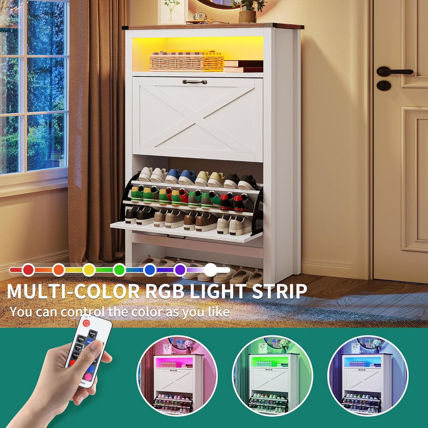 - LED light strips: This 2 drawers shoe cabinet boasts RGB led strip lights, standing out and adding a nice touch to your room. Effortlessly adjust the LED lights with a remote wherever you are.