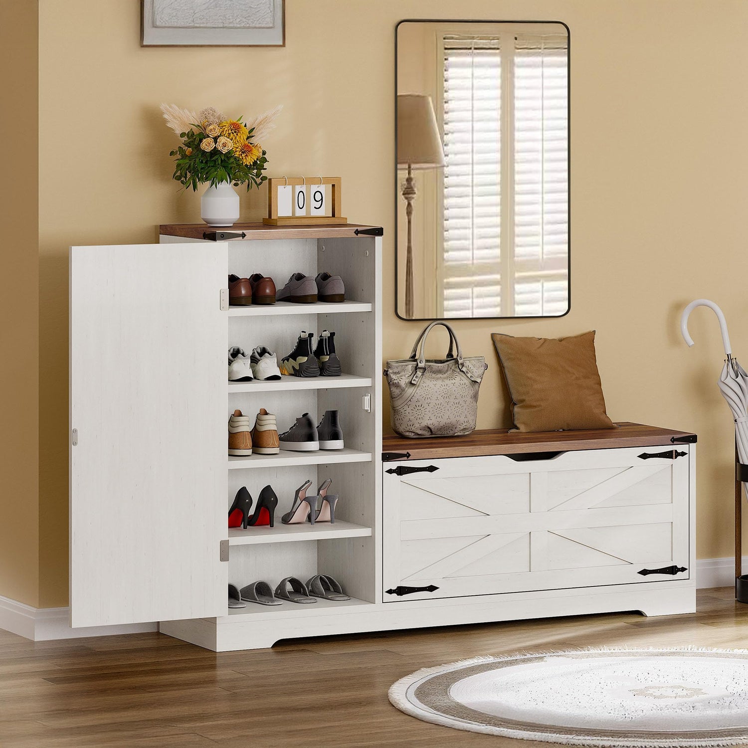 YITAHOME Shoe Cabinet with Bench, Shoe Storage Cabinet with Adjustable Shelves, Farmhouse Shoe Organizer Cabinet, L-Shaped Shoe Cabinet Storage for Entryway, Hallway, Living Room, White & Brown