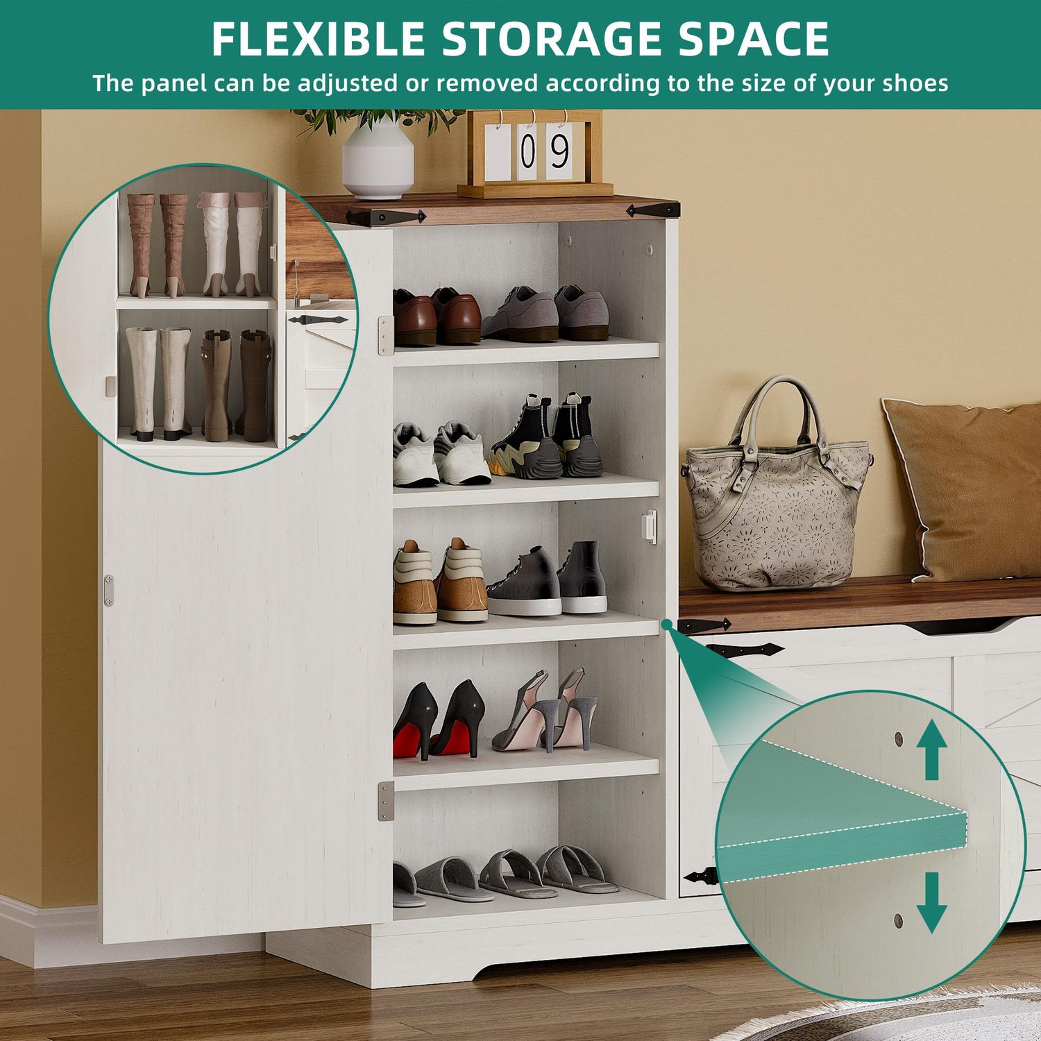 • Customizable Shoe Storage: With 3 adjustable shelves and 1 fixed shelf, this shoe cabinet storage lets you neatly store everything from high heels to bulky boots. You'll have 5 spacious tiers to keep your shoes tidy without the constant rearranging struggle