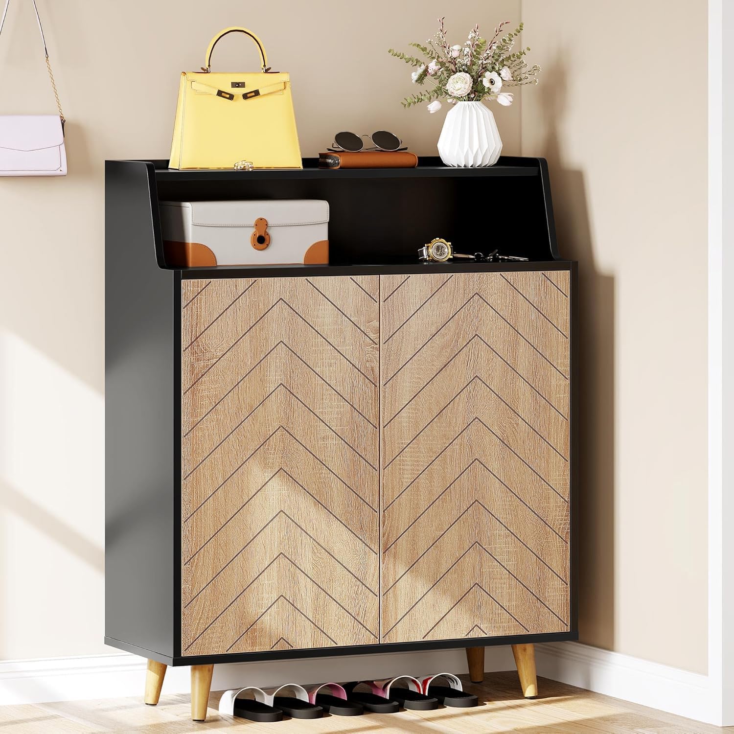 • Elegantly refined: Featuring exquisite herringbone pattern, this shoe cabinet with doors adds a natural charm to your home. It effortlessly complements any furniture in entryways, living rooms, hallways, and small apartments.
