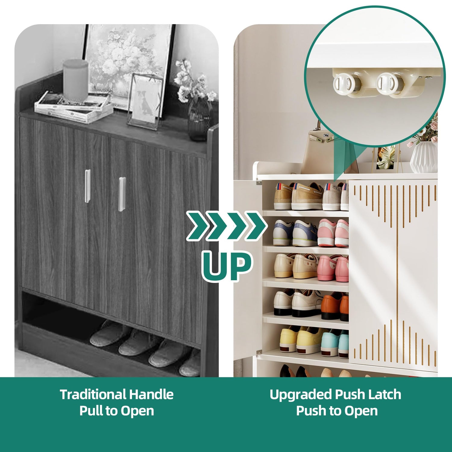 • Effortless access: The spring-hinged magnetic doors make grabbing your shoes a breeze. No more fumbling with handles - just press, choose your pair, and head out in style