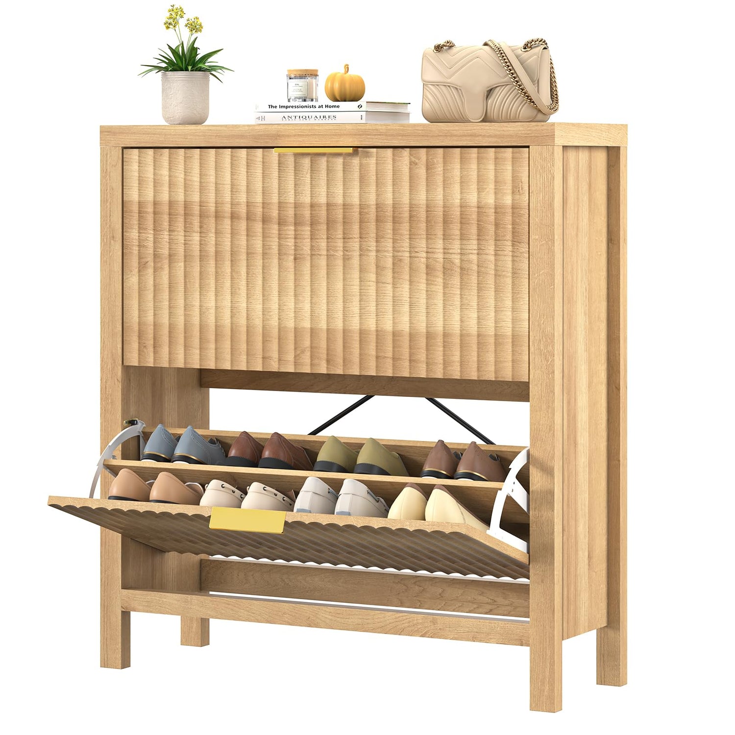 YOMILUVE Shoe Cabinet Storage for Entryway, Fluted Shoe Cabinet with 2 Flip Drawers, Hidden Shoe Rack Tall Freestanding Shoe Organizer with Legs for Hallway, Wood