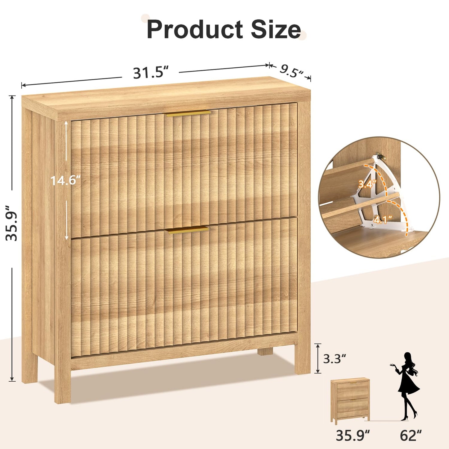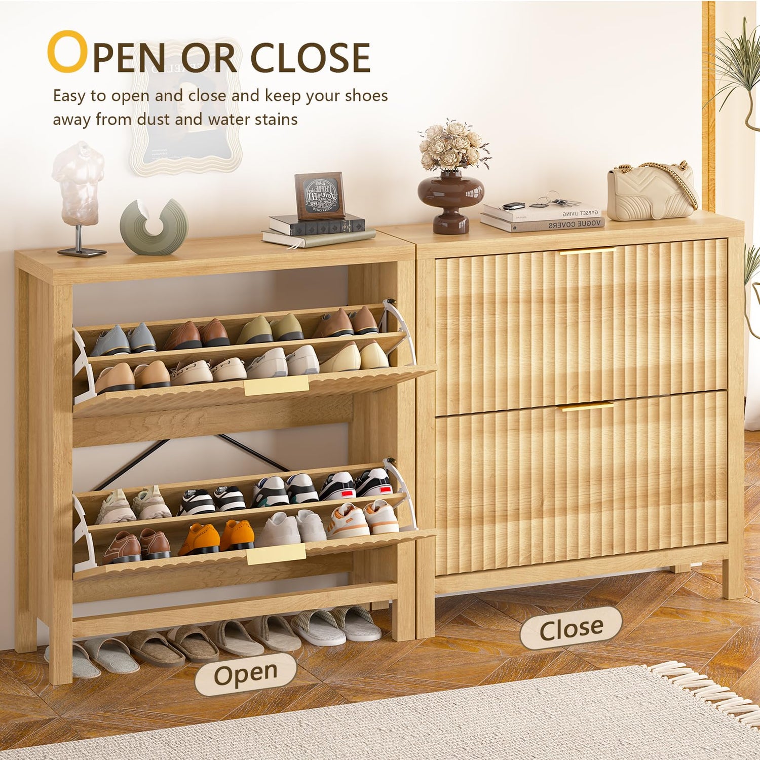 - Wavy Fluted Texture: This shoe cabinet features a unique wood-colored wave-shaped fluted panel, which enhances the texture and visual depth of the space and highlights the natural beauty of the wood. This shoe cabinet complements any style and decoration. Perfect for placing in your entryway, hallway, or living room