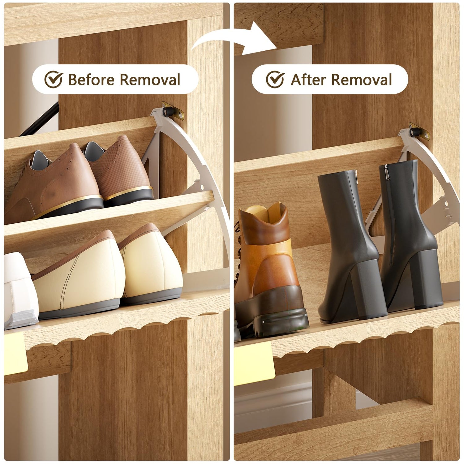 - 2 Flip Drawers: The shoe cabinet features 2 flip drawers, which are easy to open and close and keep your shoes away from dust and water stains. Each drawer contains 2 layers of storage space. The panel can be adjusted or removed, which can accommodate flat shoes, or high heels of different heights and sizes