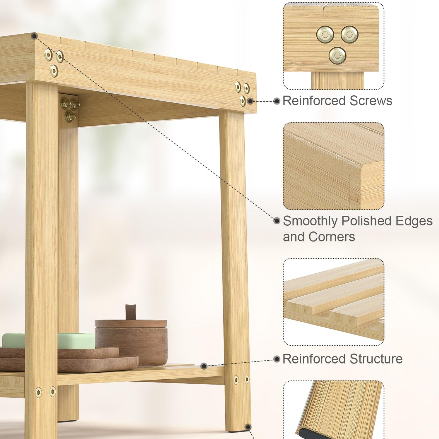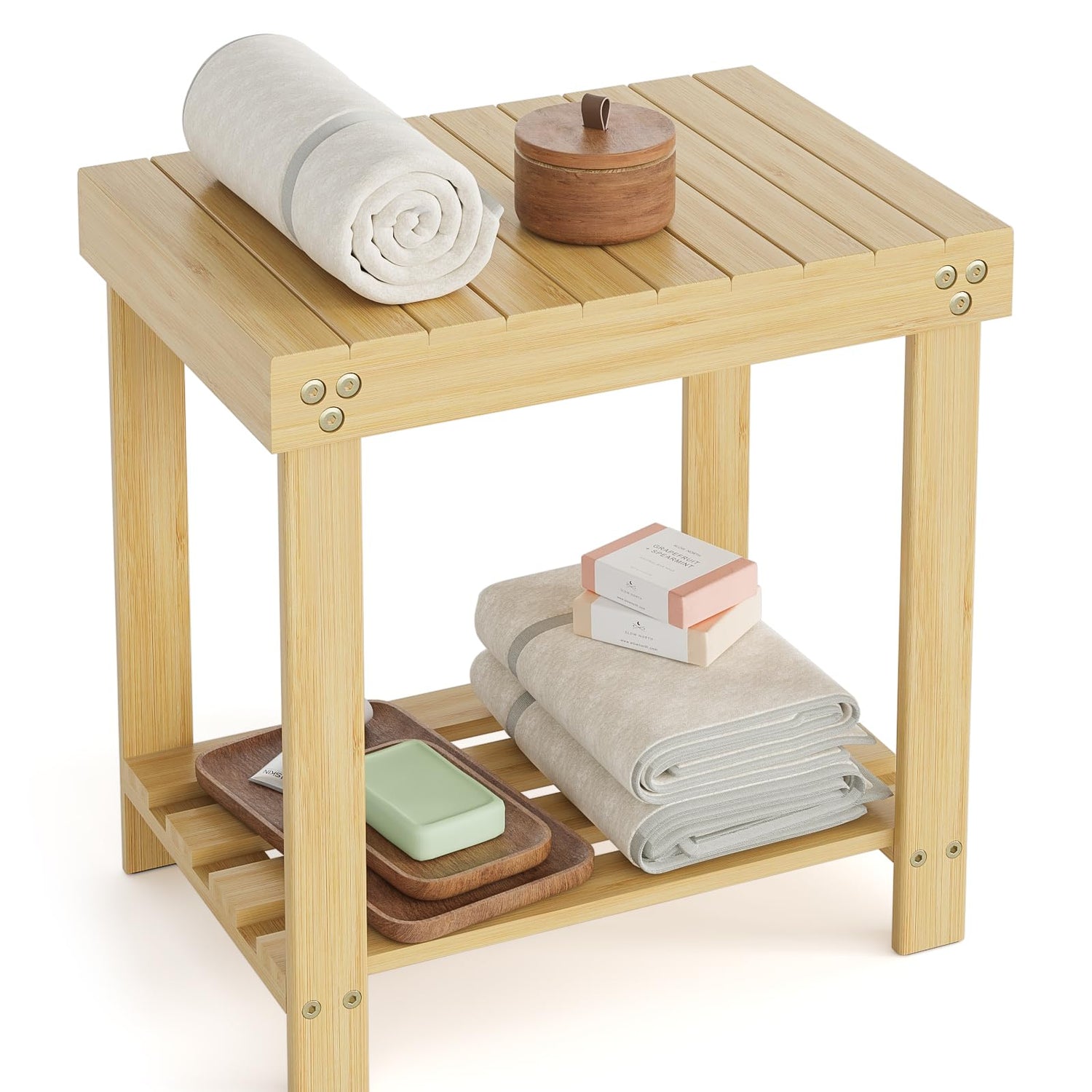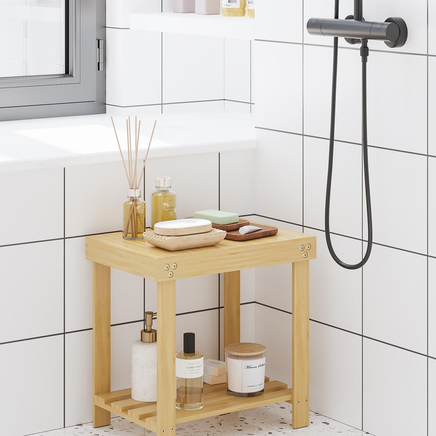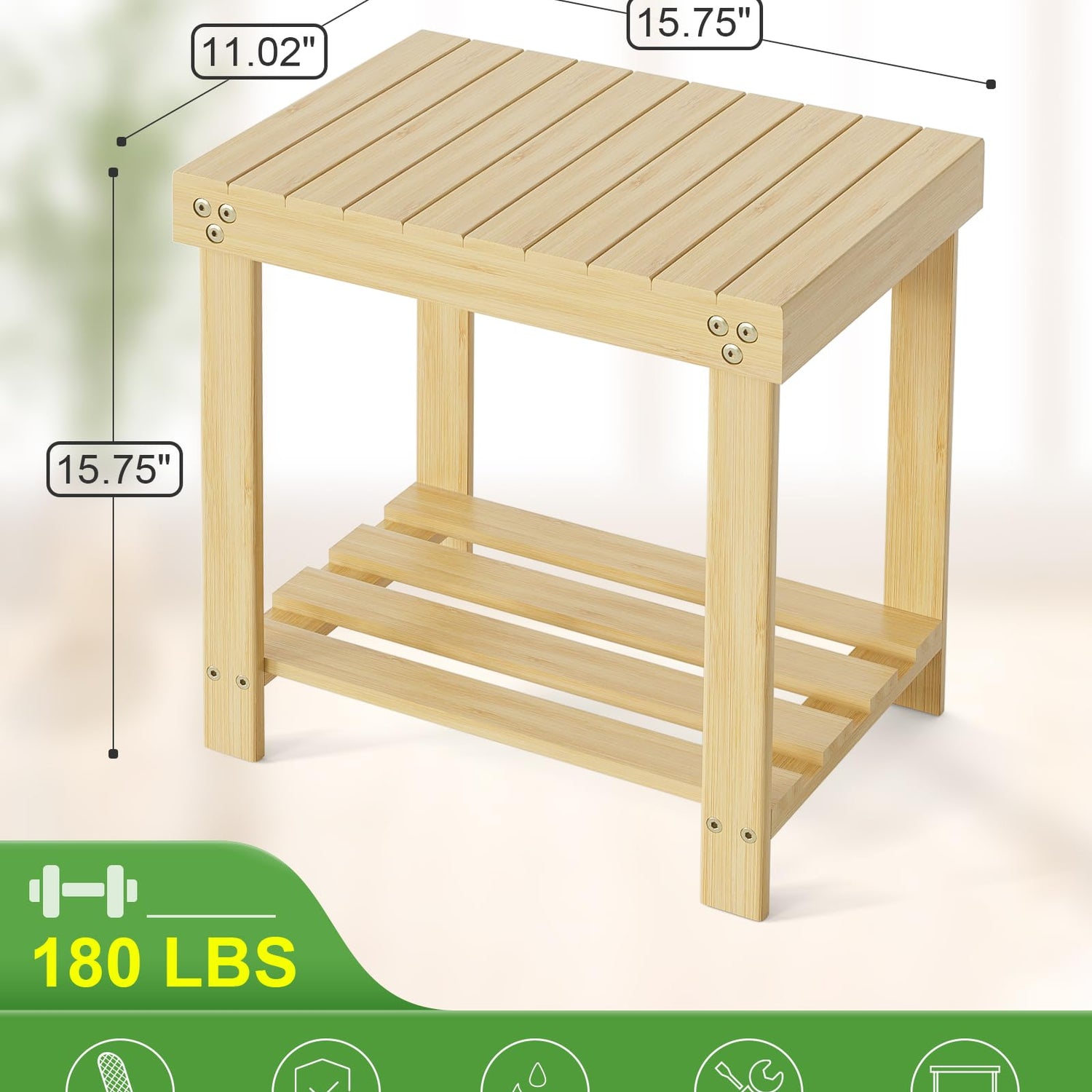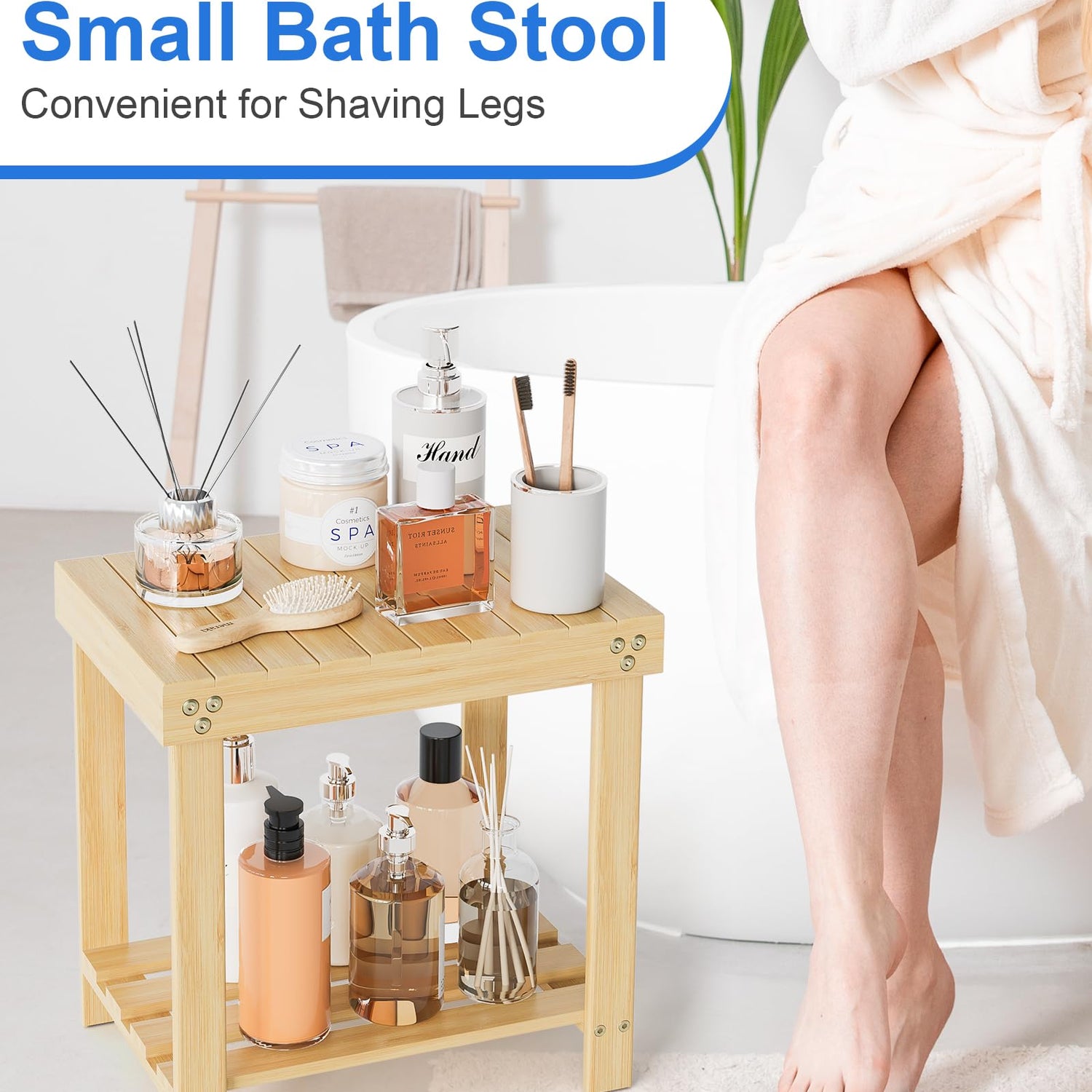 • What You Get: A bamboo bench that allows you to sit down for shaving legs, spa and shower, also can keep your bathroom accessories under control with the shelf underneath. It also can be footstool, bedside table, indoor and outdoor use