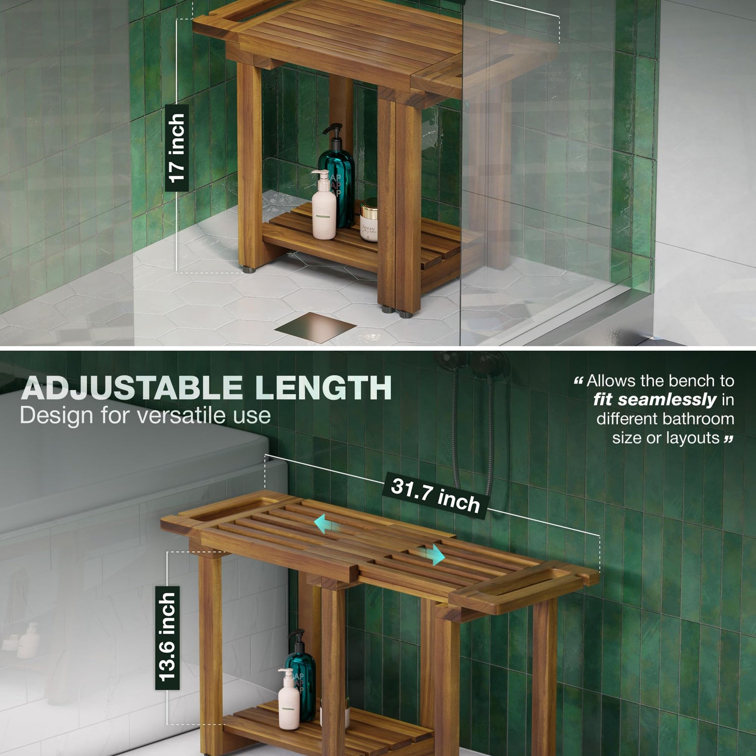 - π οΈ Adjustable Size for Versatile Use: This Acacia wood shower stool bench chair adjusts from 23.1β to 31.7β in length, with a width of 11β and a height of 17β, making it adaptable to different bathroom sizes and layouts for ultimate flexibility.