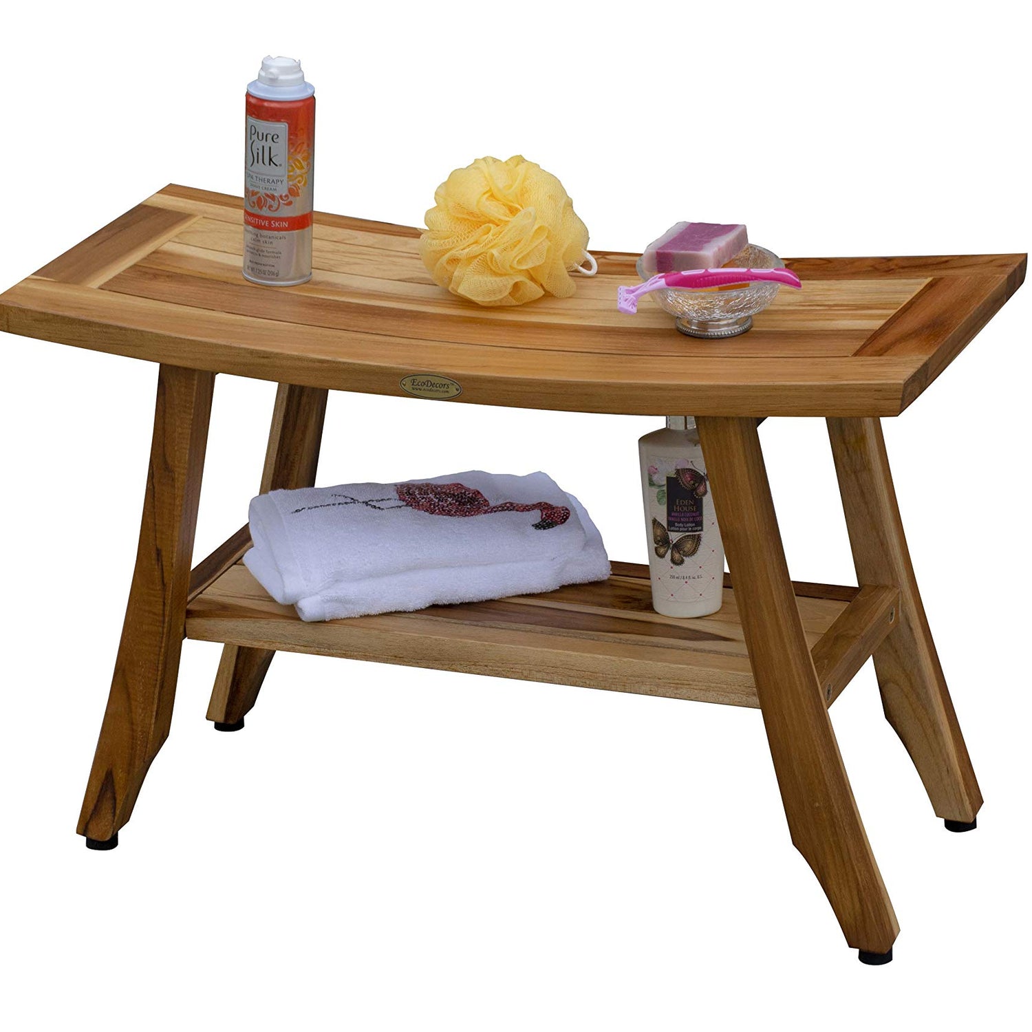 - Practical Design: Maximize your space with our teak shower benches. Complete with a built in shelf for convenient storage, this spa bench can improve your shower experience by keeping your bath essentials in reach while maintaining a clean, organized look.