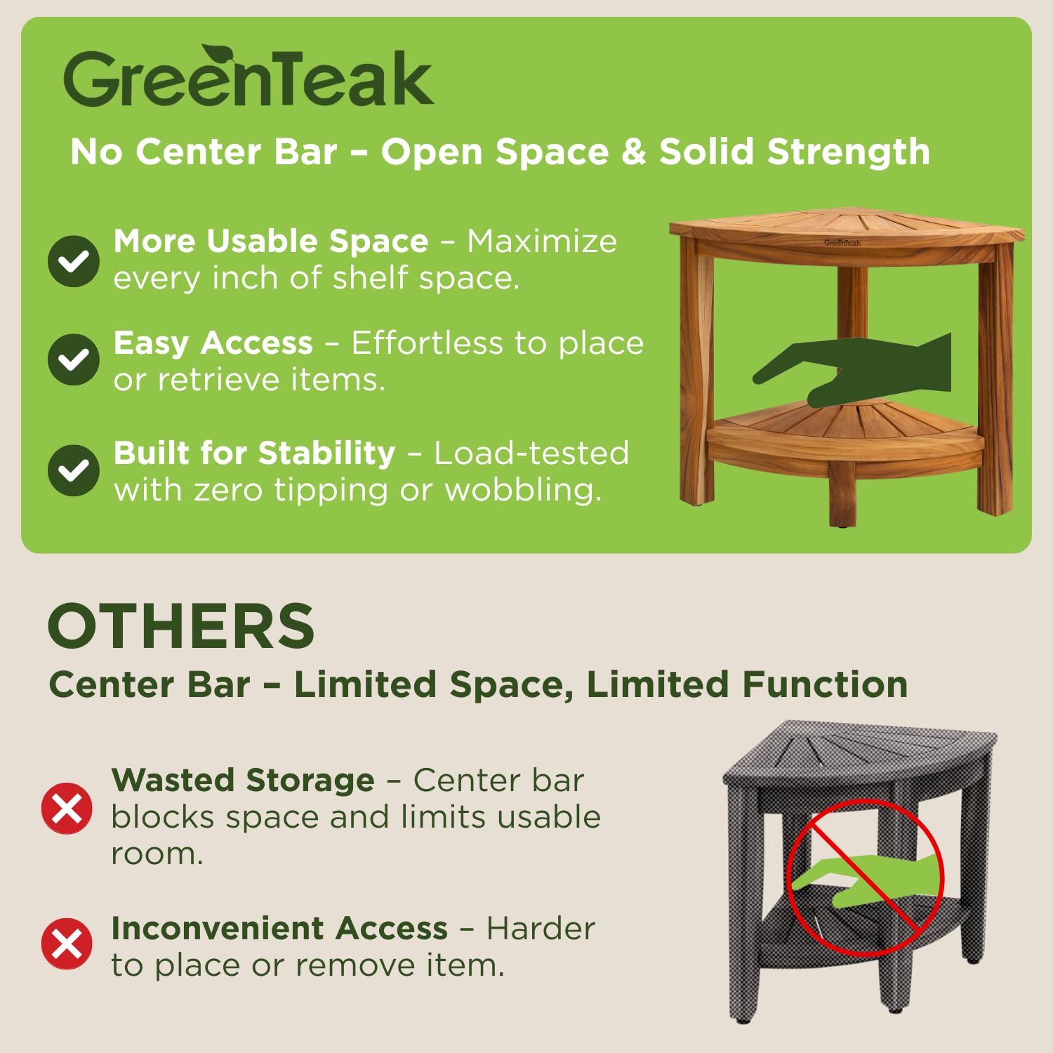 GREENTEAK Premium 15.7" Corner Shower Stool with Storage Shelf, Waterproof Teak Shower Stool for Shaving Legs and to Sit On, 2-Tier Shower Stool, Teak Shower Bench for Bathroom, 300 Lbs Capacity