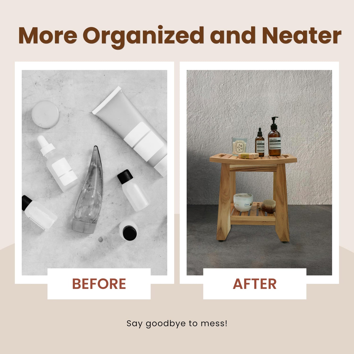 - Compact & Functional: Measuring 14" x 10" x 15", Our small teak shower stool is perfectly sized for smaller showers, corners, or limited spaces. The integrated lower shelf offers extra storage for bath essentials like towels or soap, combining practical organization with clean, modern style.