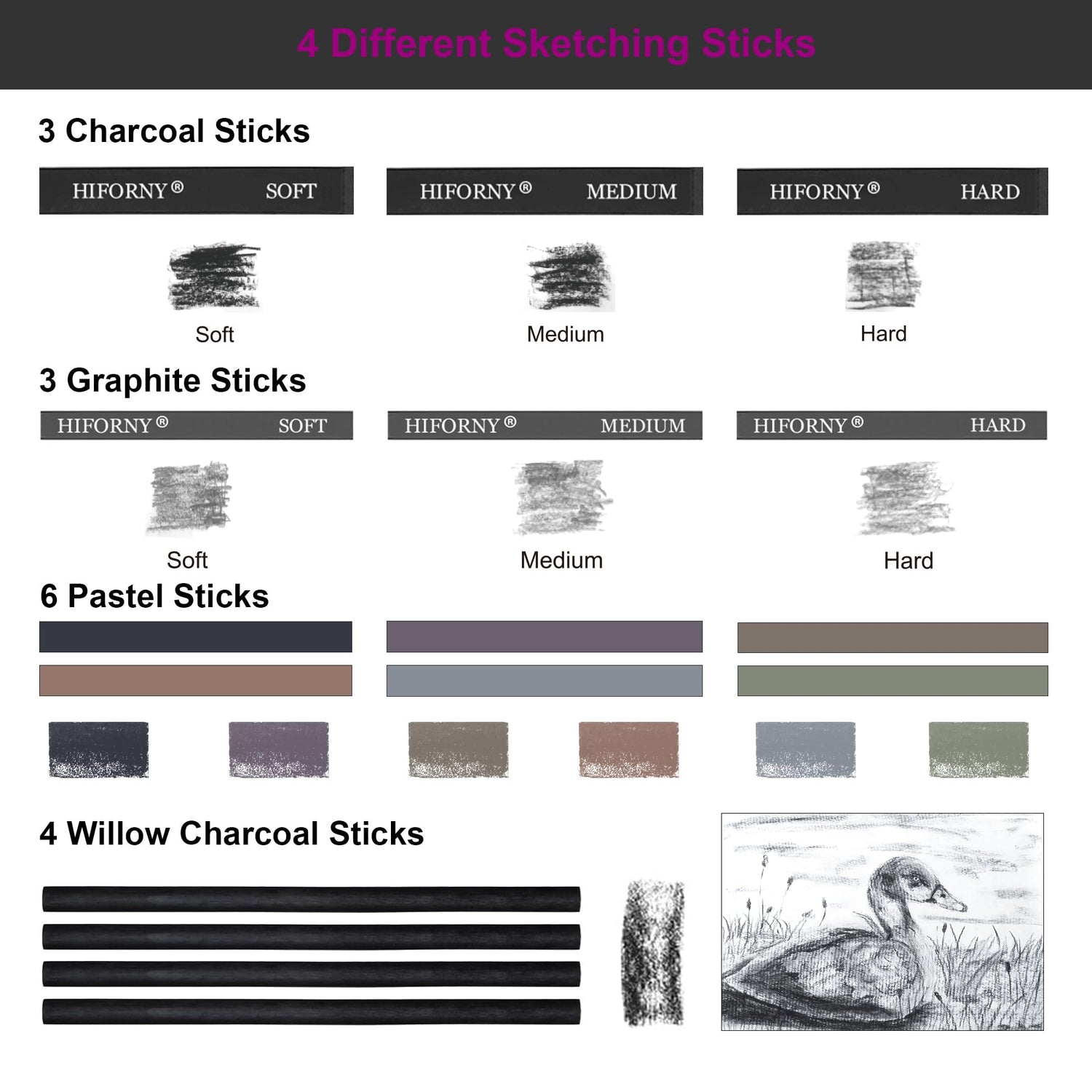 - Complete Drawing Pencil Set: HIFORNY 100 PCS sketching and drawing kit includes 24 premium graphite pencils(14B,12B,10B, 9B, 8B, 7B, 6B×2, 5B, 4B×2, 3B, 2B×3, B, HB×2, F, H, 2H, 3H, 4H, 5H), 3 black charcoal pencils, 3 white charcoal pencils, 1 woodless graphite pencil (6B), 1 eraser pencil with brush, 4 willow charcoal sticks, 6 pastel sticks, 3 graphite and 3 charcoal sticks. Each pencil is clearly labeled for easy selection—perfect for sketching, shading, blending, and layering.