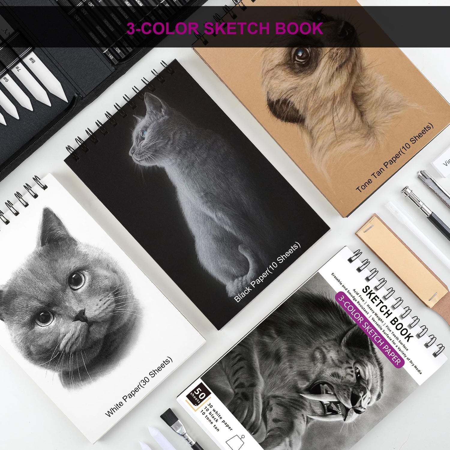 - Unique 3-Color Sketchbook: 6 x 9", 100GSM, 50 Pages (30 pages white, 10 pages toned tan, 10 pages black) - Different colors of sketch paper are suitable for different styles of drawing, one sketchbook can meet your needs for different colors of sketch paper, no need to spend more money to buy different colors of sketchbooks.
