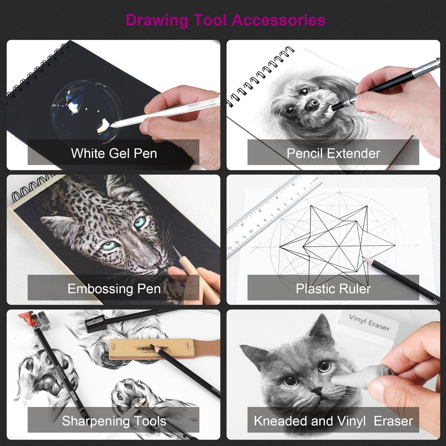 - Essential Drawing Tools: This versatile art set also includes 8 blending stumps(#1-#8), 4 tortillions(#1-#4), 2 sketch scrapers, 20 replacement heads, 6 eyeshadow applicators, 1 blender sponge, 1 white gel pen, 1 embossing pen,1 pencil extender, 1 plastic ruler, 1 kneaded eraser, 1 vinyl eraser, 2 sharpeners, 1 sandpaper block and 1 art knife—everything you need for detailed work and creative exploration. Great for both beginners and professional artists.