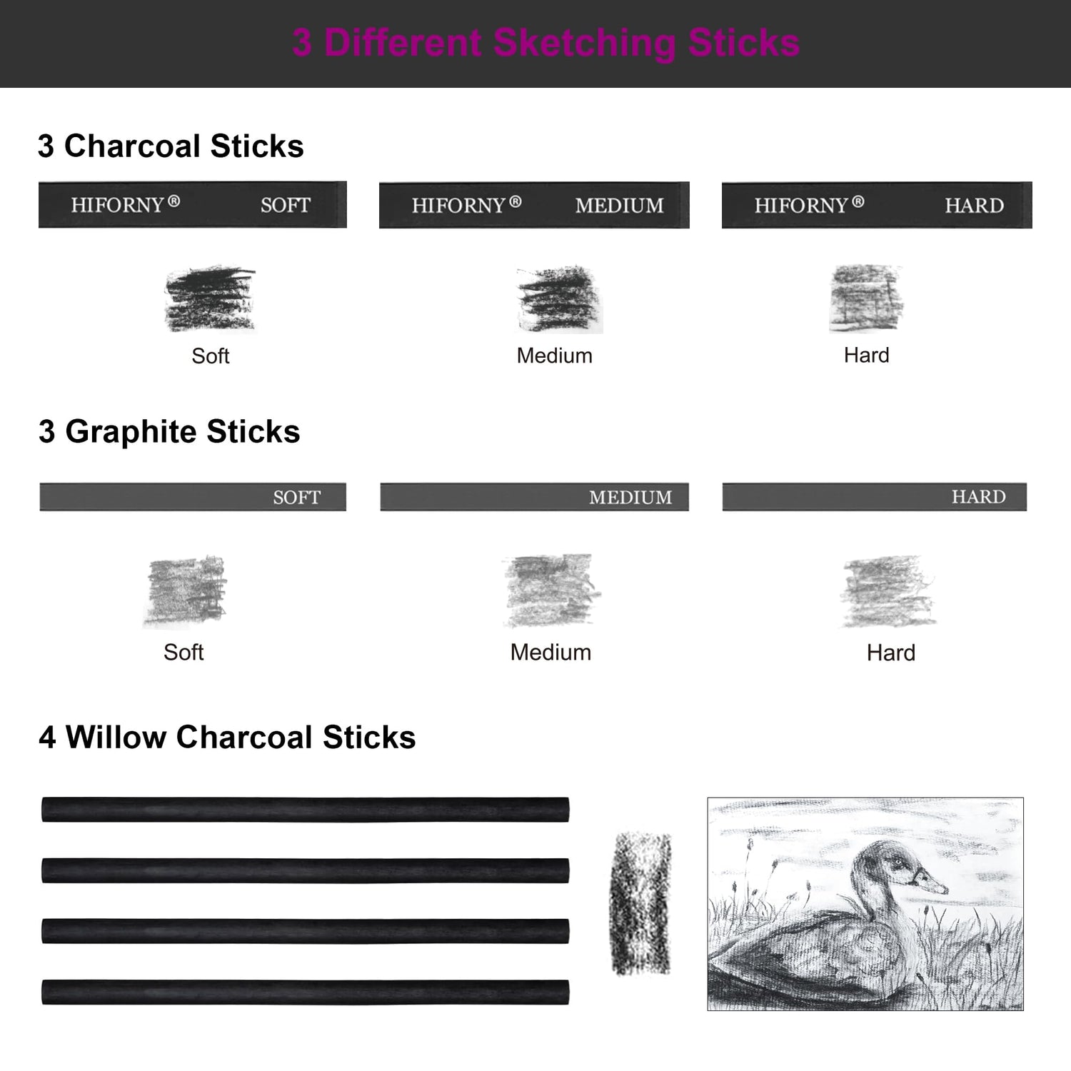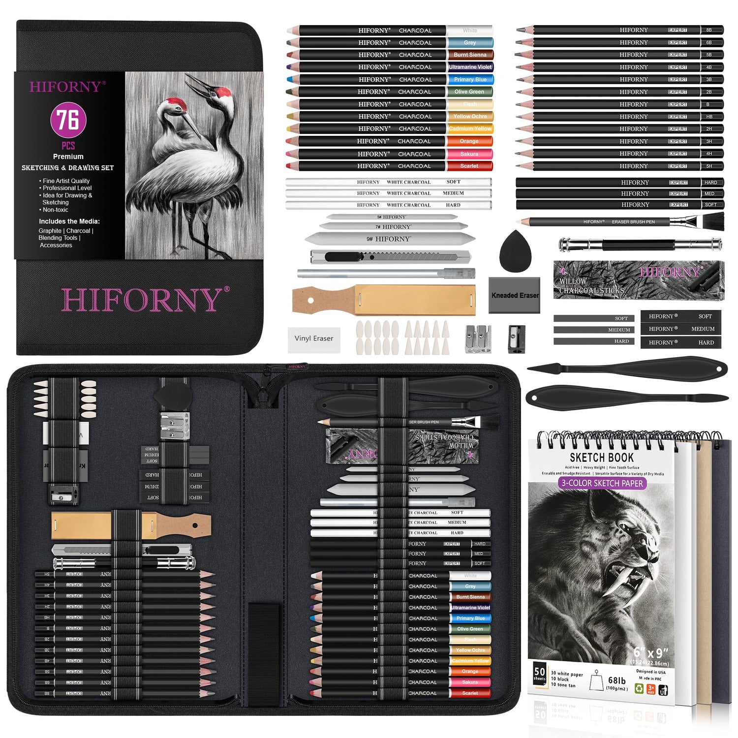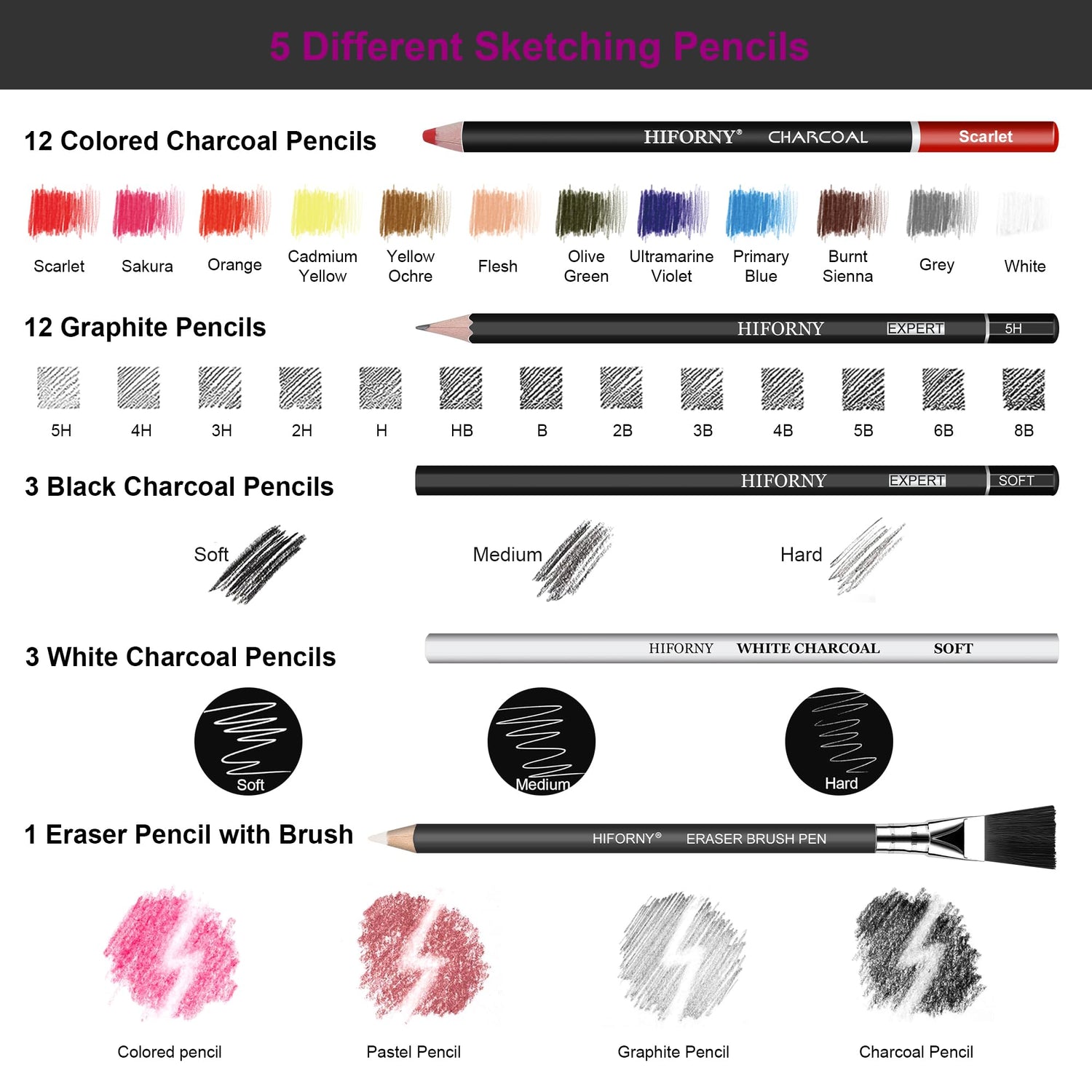 - Complete Drawing Pencil Set: HIFORNY 76 PCS sketching and drawing kit includes 12 premium graphite pencils (8B, 6B, 5B, 4B, 3B, 2B, B, HB, 2H, 3H, 4H, 5H), 12 Colored Charcoal Pencils, 3 black charcoal pencils, 3 white charcoal pencils, 1 eraser pencil with brush,4 willow charcoal sticks, 3 graphite and 3 charcoal sticks. Each pencil is clearly labeled for easy selection—perfect for sketching, shading, blending, and layering.