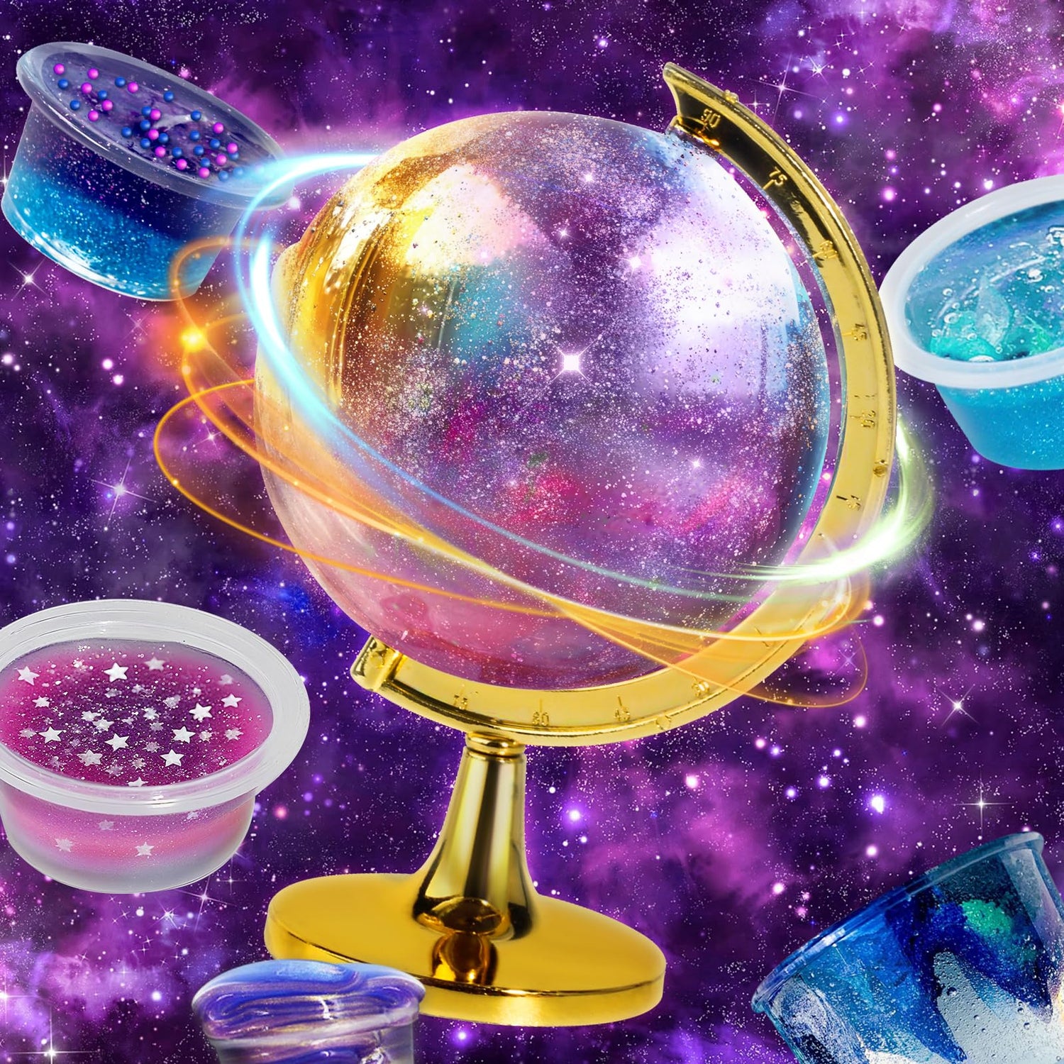 - Unique Cosmic Containers: Unlike other galaxy slime kits, this set brings exclusive cosmic containers: a golden globe-shaped slime containers and 4 magic potion bottles for charming slime storage and display.