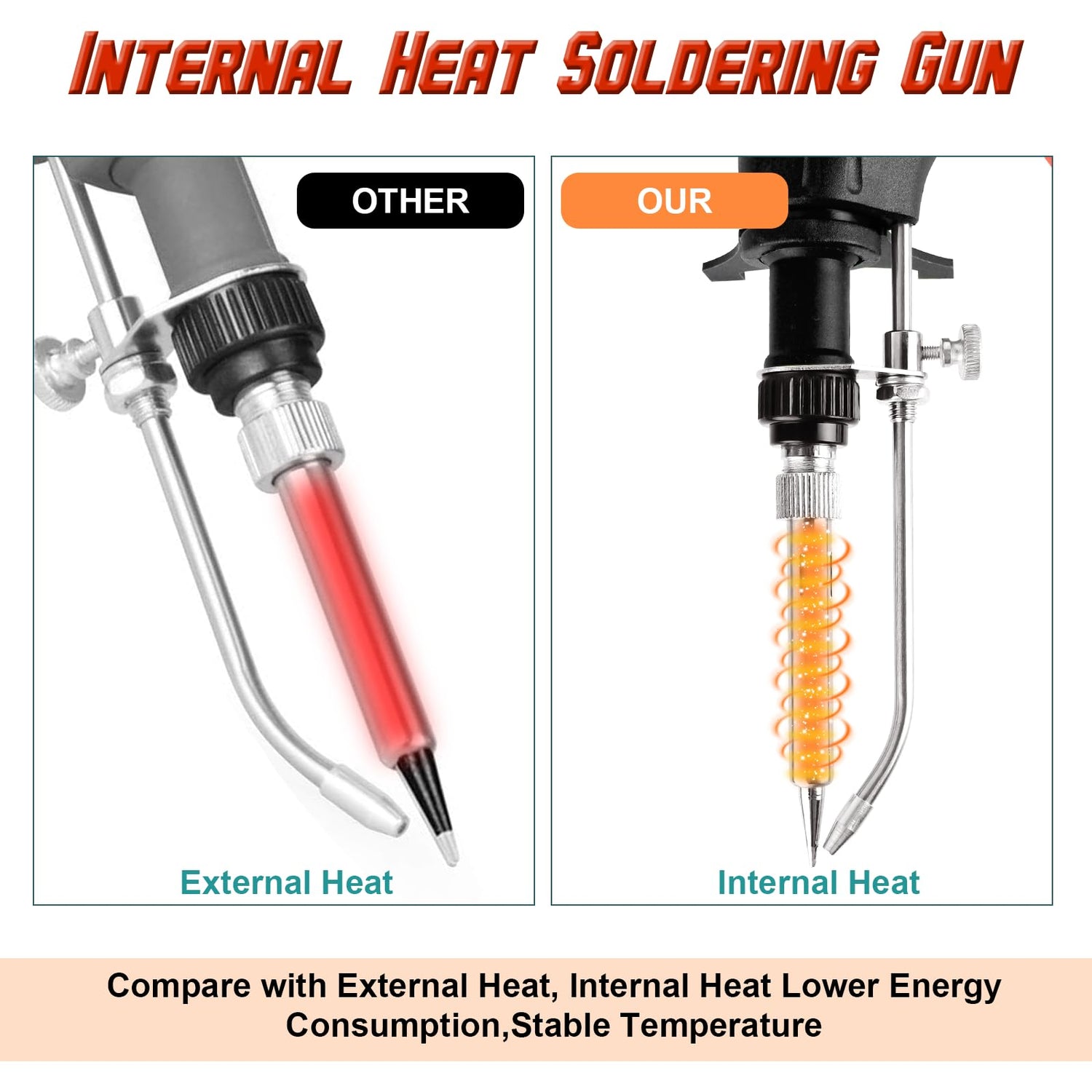 - Internal Heating: The internal heating soldering gun in our soldering iron kit provides precise heating, the natural Ceramic heating core allows the soldering iron to heat up faster, eating core to reach the desired temperature within 10 secs, compare with external heating solder guns, the internal heating soldering kit less loss, this soldering gun. more longer lifespan for the soldering tools.