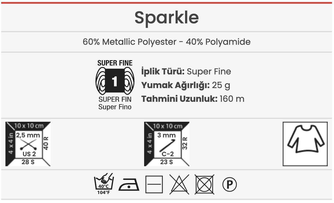 Details: YarnArt Sparkle brings a touch of brilliance to your knitting and crochet projects with its metallic structure. This lightweight yarn is perfect for adding a shimmering effect to a variety of designs, including bags, belts, hats, and even home accessories. Suitable for both knitting and crocheting, YarnArt Sparkle is versatile and easy to work with, making it ideal for creative, eye-catching projects. You can combine this yarn with cotton or wool blends to create unique and original designs. Its lightweight composition ensures that your projects will be comfortable to wear or use, while the metallic polyester gives them a durable, sparkling finish. Please note, due to variations in dye lots, there may be slight color differences between the product shown on the screen and the one you receive. To ensure consistency, we recommend purchasing enough yarn for your project in one order. Fiber Content: 60% Metallic Polyester, 40% Polyamide Weight: 25g Length: 160m Recommended Needle Size: 2.5mm Recommended Hook Size: 3mm Yarn Weight: Fingering - Sock (1) Applications: Ideal for fashion accessories, home decor, and creative designs Features: Lightweight, durable, and easy to combine with other yarns Add a sparkling touch to your knitting and crochet projects with YarnArt Sparkle!