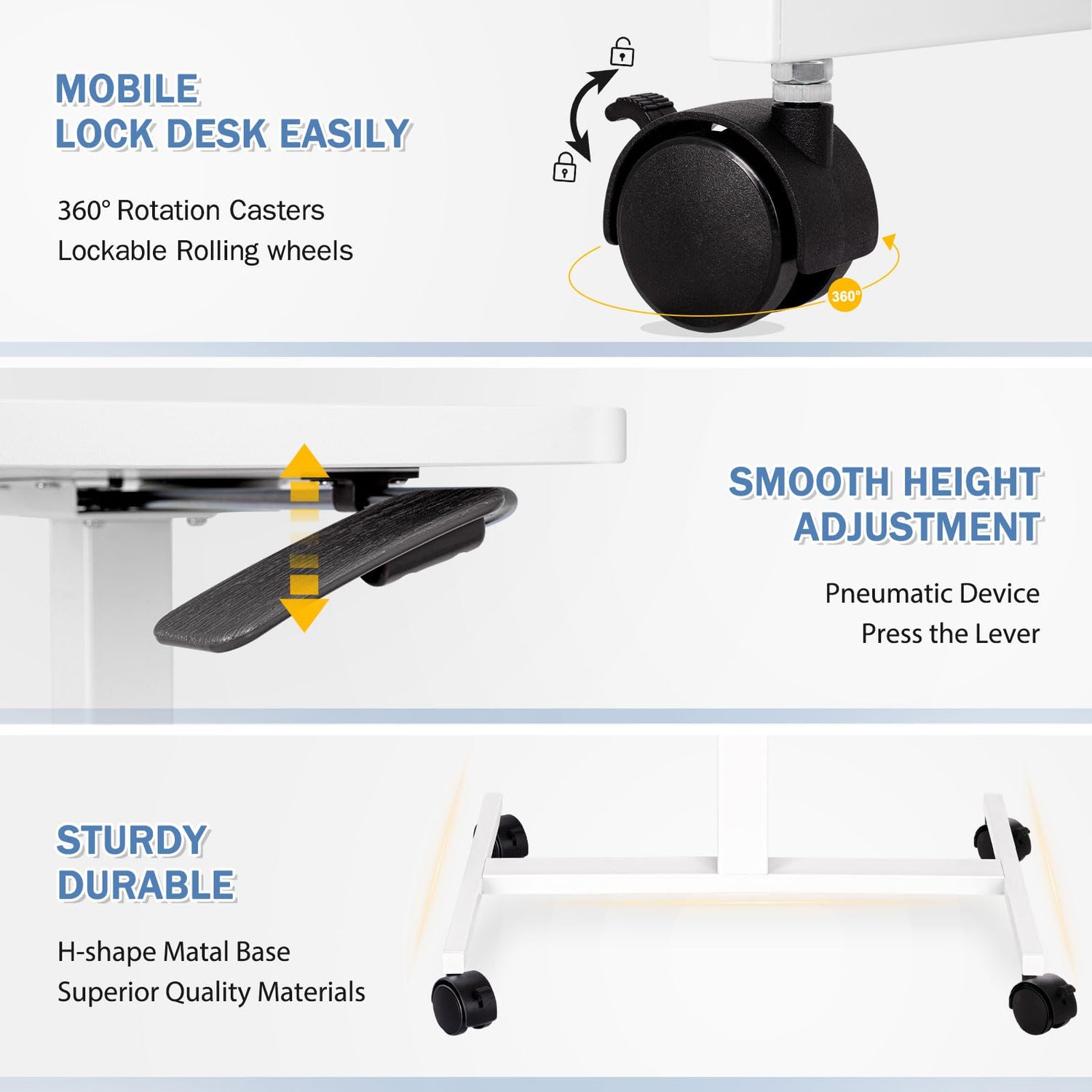 - [Hight Adjustable] -- Press the Lever to elevate or lower the rolling desk effortlessly to achieve optimal ergonomic positioning by a powerful Pneumatic Device. Flexible to Adjust Hight 28 Inches to 44 inches as you need for sitting or standing