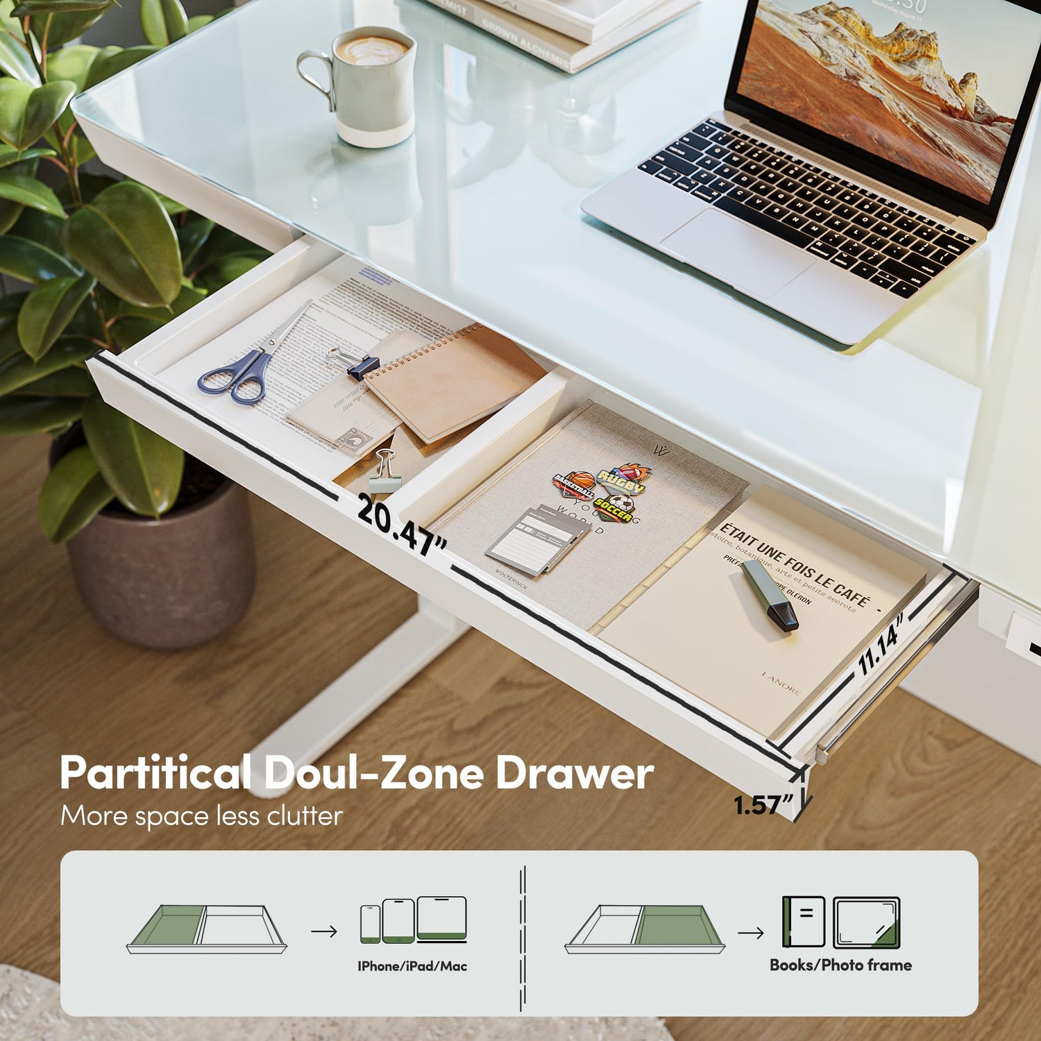 - Whole-Piece Glass Desktop: The Whole-Piece Desktop can provide a more solid table top, and with the glass material, the table top cleaning become more convenient.