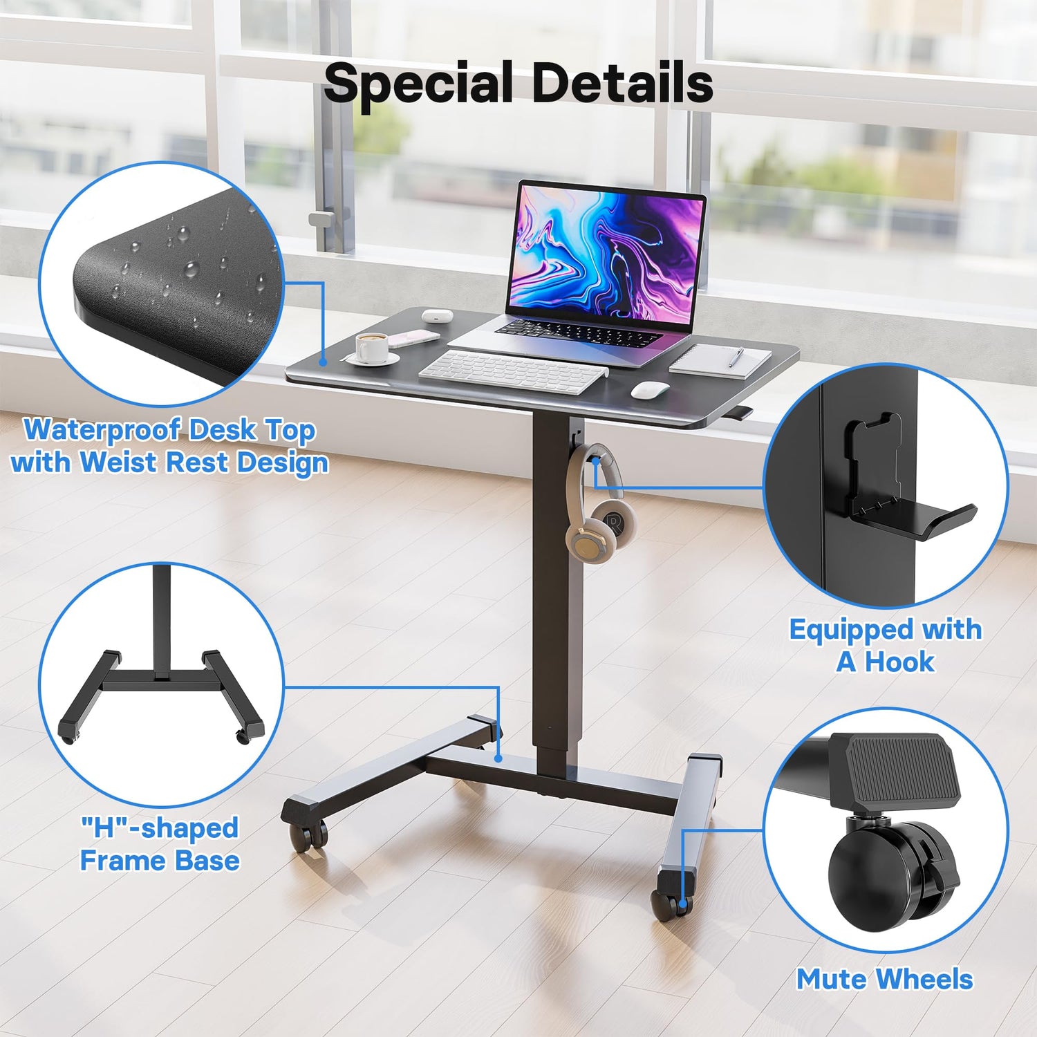 - Technical details: Our pneumatic mobile podium top is made of MDF materials. The premium board is waterproof, scratch resistant and very easy to clean. The mobile desk hook can be used to hang items like earphones or your laptop bag. The maximum load capacity for the desktop is 33lbs. The "H"-shaped frame base ensures the stability of the table