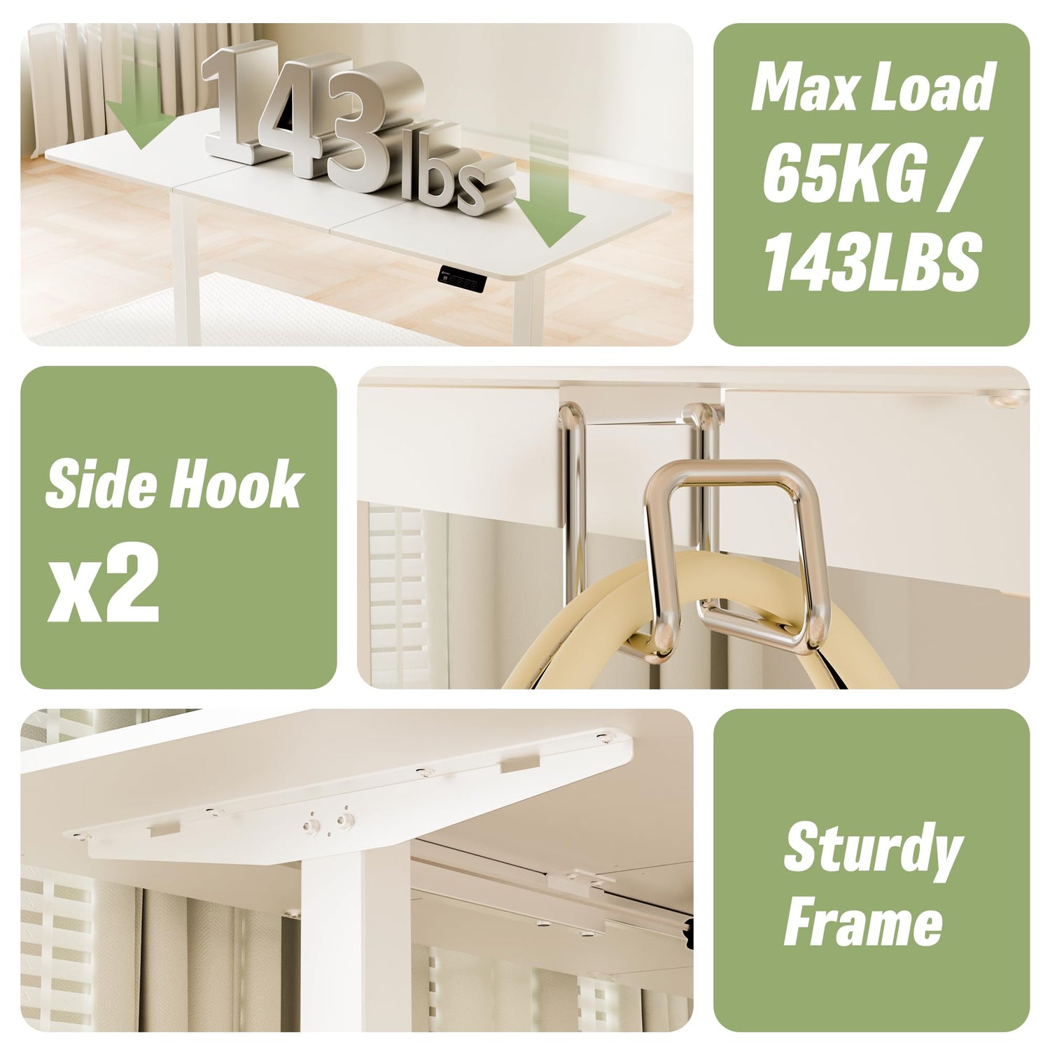 - Spacious Work Area: The desktop size of this standing desk is 55 x 23.6 inch, which provides space for various monitors and laptops. You can put all the necessary office supplies on your electric stand up desk. There are hooks on both sides of the table so that you can hang the bags or headphones for easy storage
