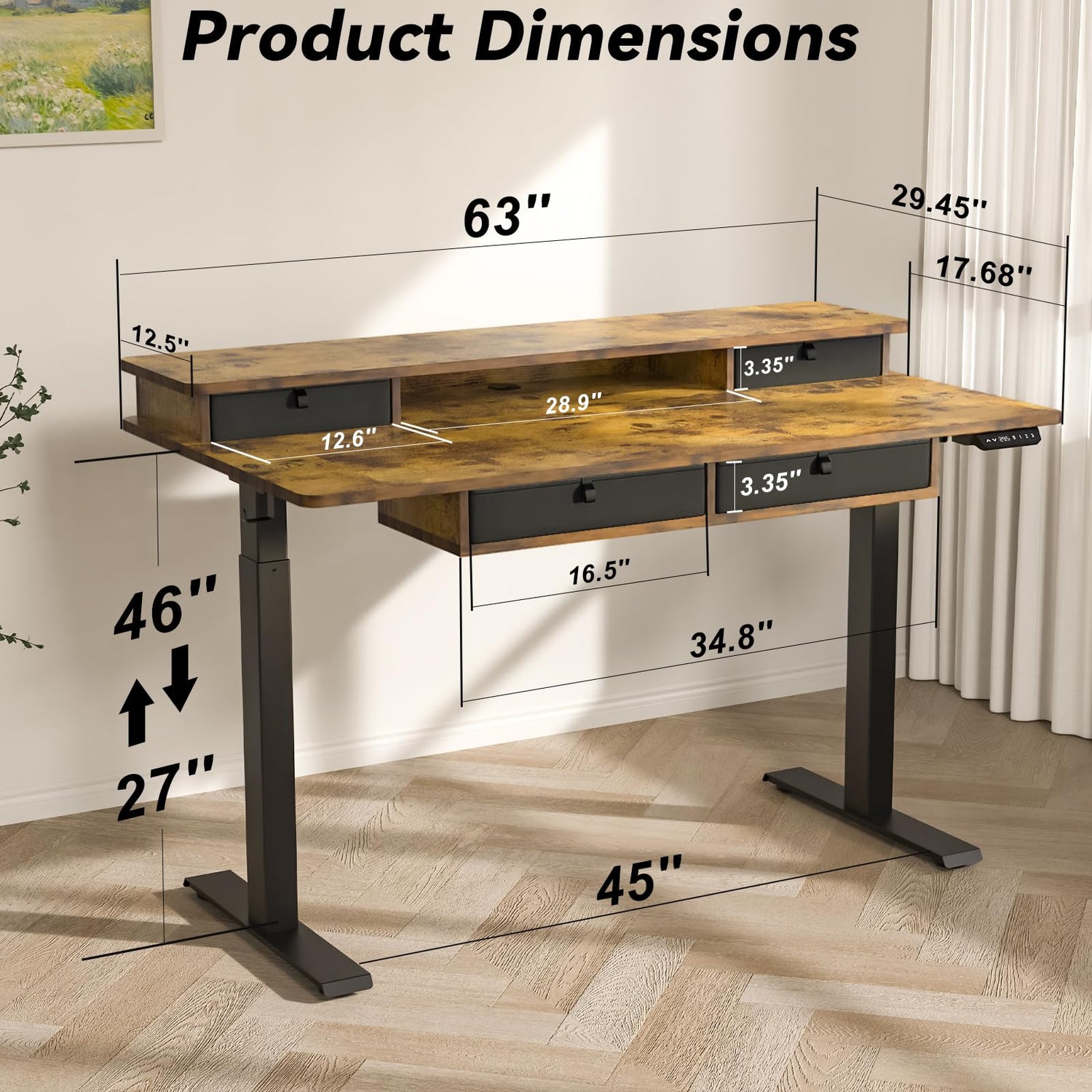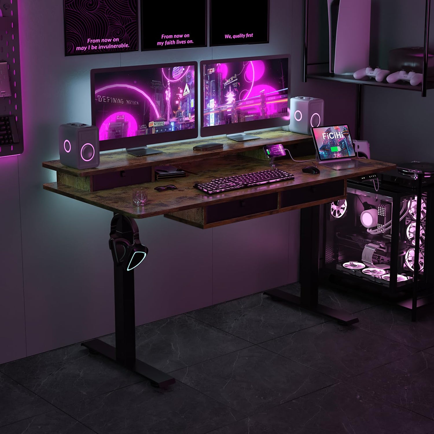 FICIHI Electric Standing Desk USB A/C Charging Port, Electric Height Adjustable Desk,63 x 30 inches Desk with 4 Drawers,Larger Table Legs,Ergonomic Workstation Suitable for Home Gaming Office