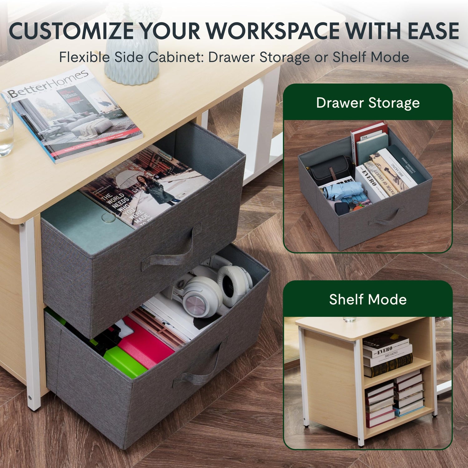 - REVERSIBLE STORAGE DRAWERS: This computer desk has two spacious drawers or shelves for storage. This desk with drawers is reversible that can be installed on either left or right. The shelves/drawers allow you to store different sizes of stuff, such as computer hosts, books, office stationeries, and small devices. The reversible open shelf or drawers design of the office desk keeps everything easy to reach and organize.