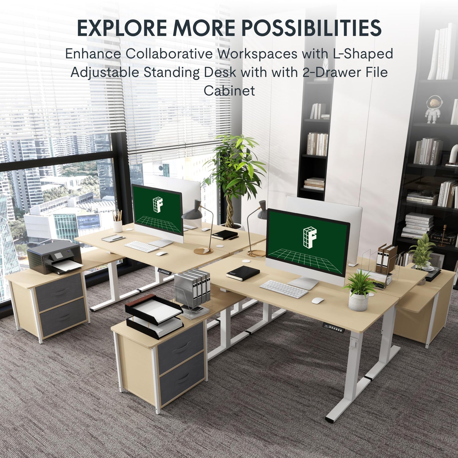 FLEXISPOT 63'' L Shaped Standing Desk with Drawers, Adjustable Height Desk with Shelves, Large Corner Stand Up Desk with Headphone Hooks for Home Office, Light Wood Grain Top+ White Frame