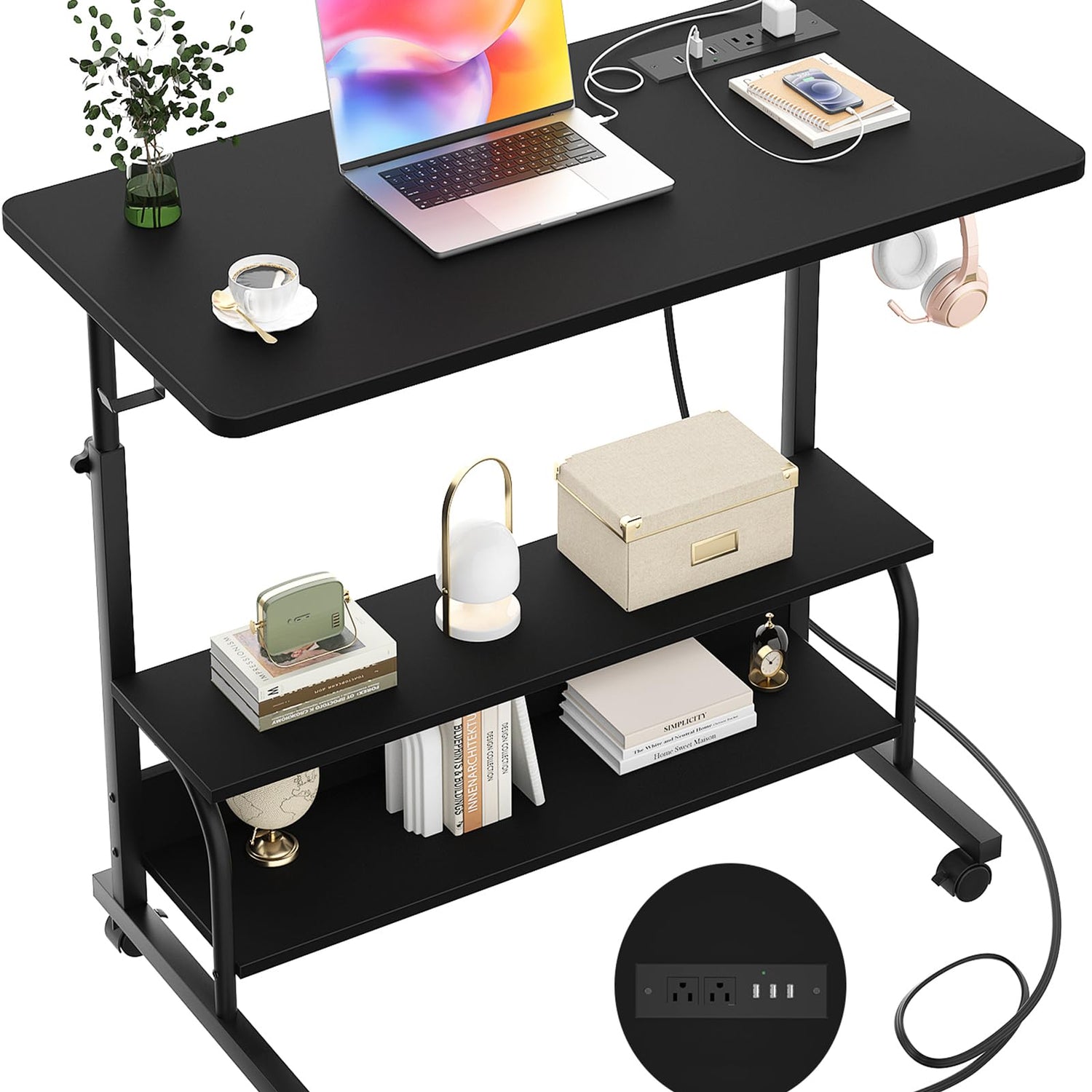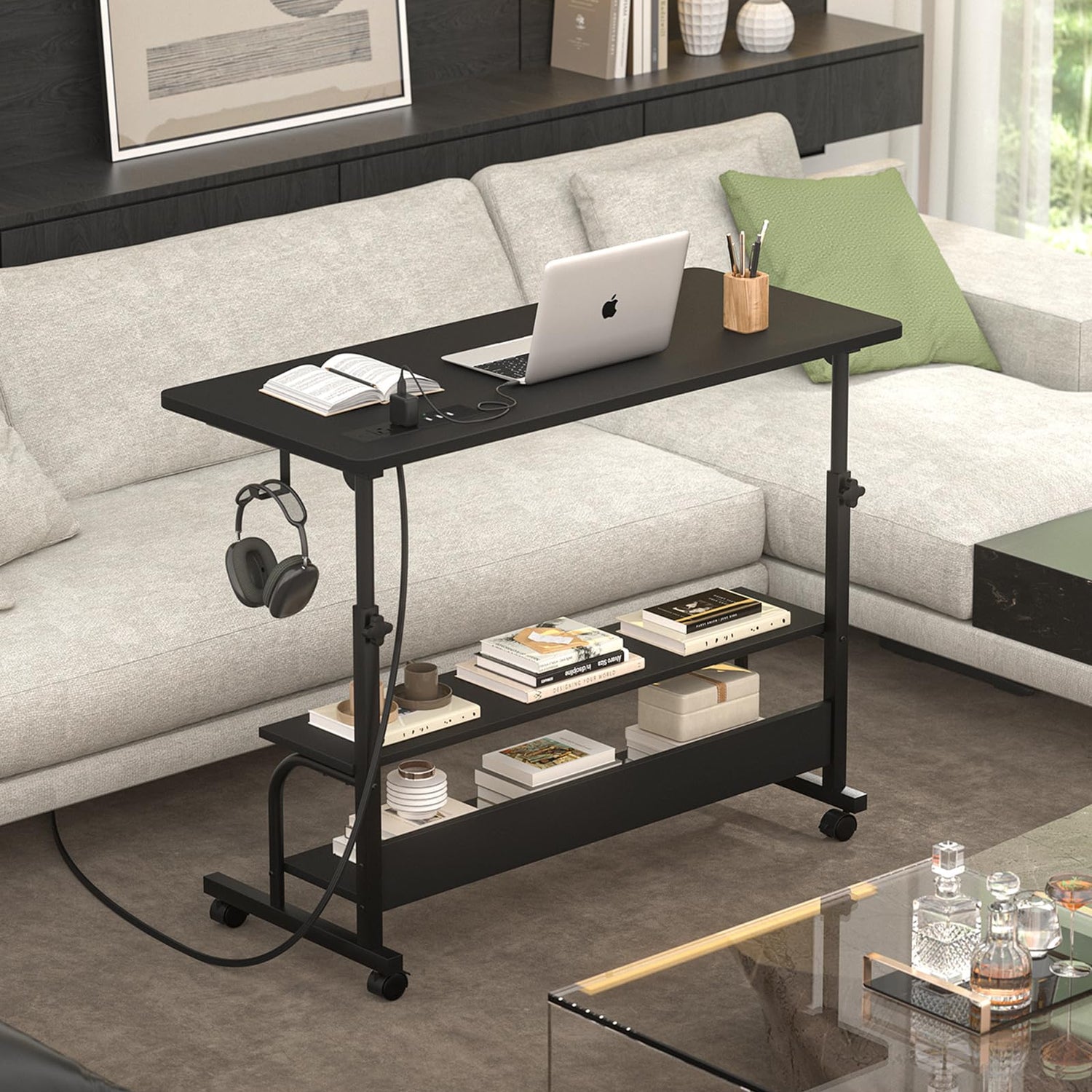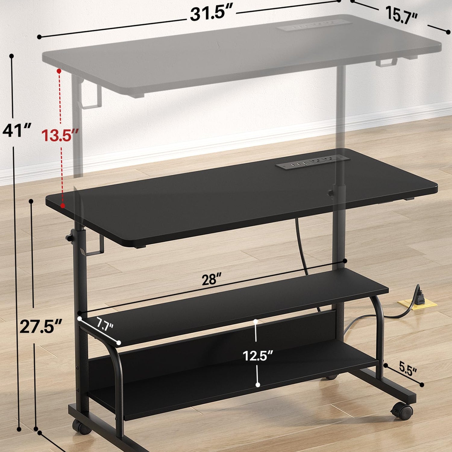 Height Adjustable Standing Desk with Power Outlets, 32" Manual Stand Up Desk with Storage Shelves Small Mobile Rolling Computer Desk Portable Laptop Table with Wheels for Home Office, Black