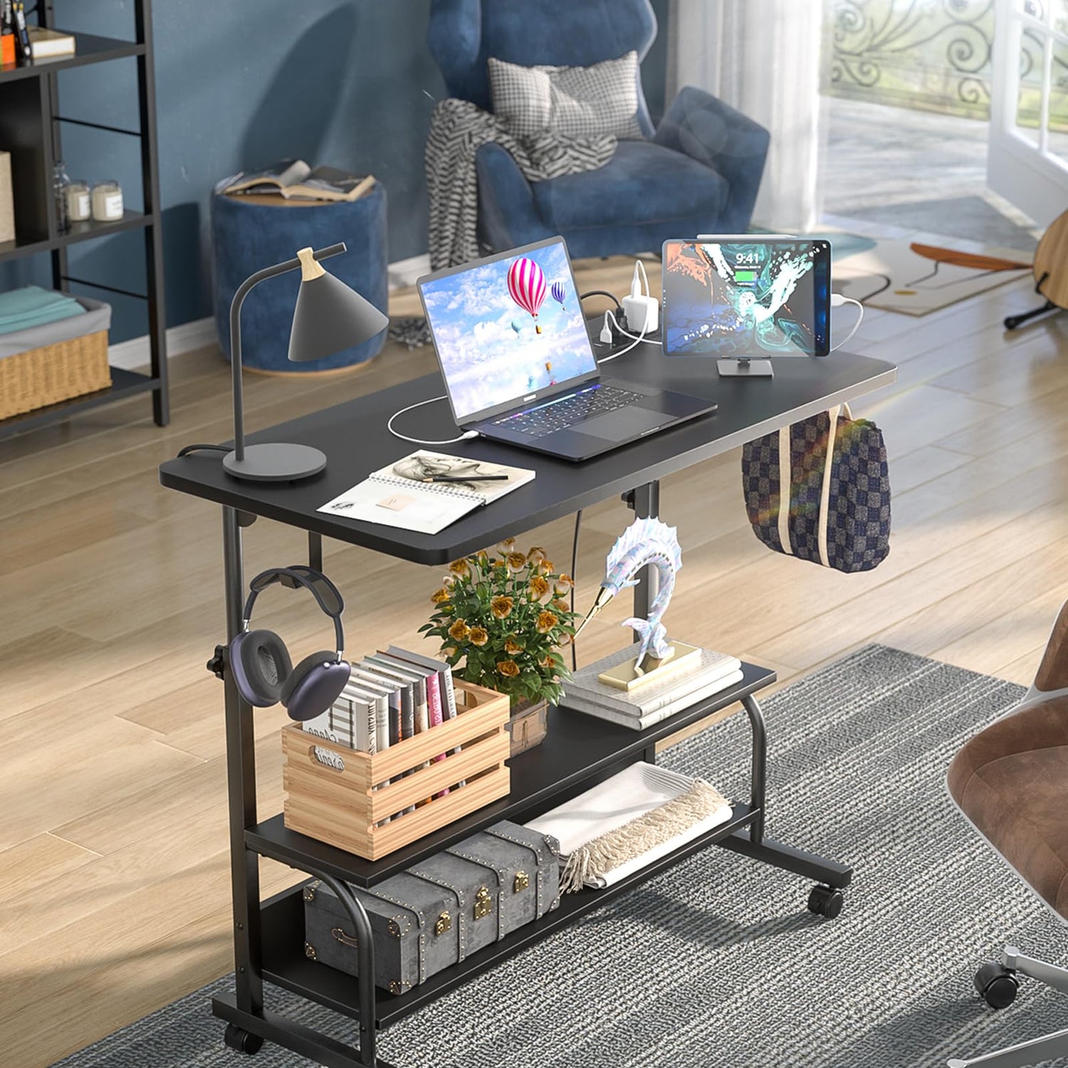 - 【Multi-Function】The rolling computer desk equipped with 4 high-quality smooth rotary wheels and non-slip footpads, you can move the desk wherever you want or fixed in one place, it offers stable moving and fantastic working experience. 2 tier opening storage shelves are convenient for you to place daily necessities and other items. Two extra desk iron hooks can save the most of your space.
